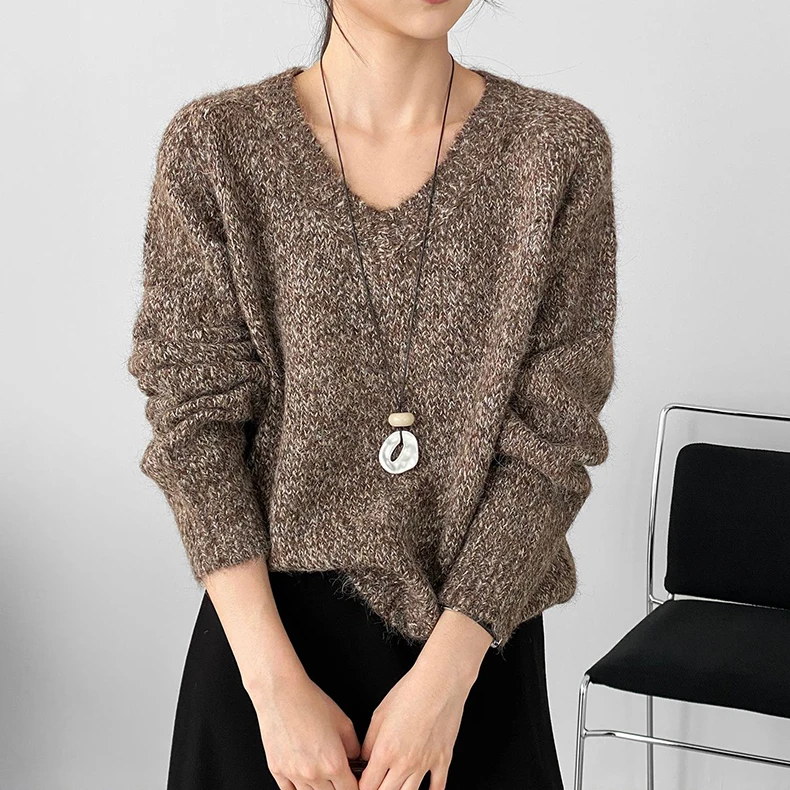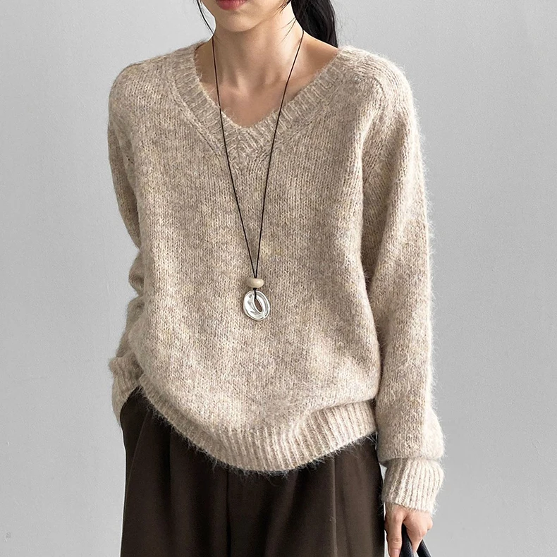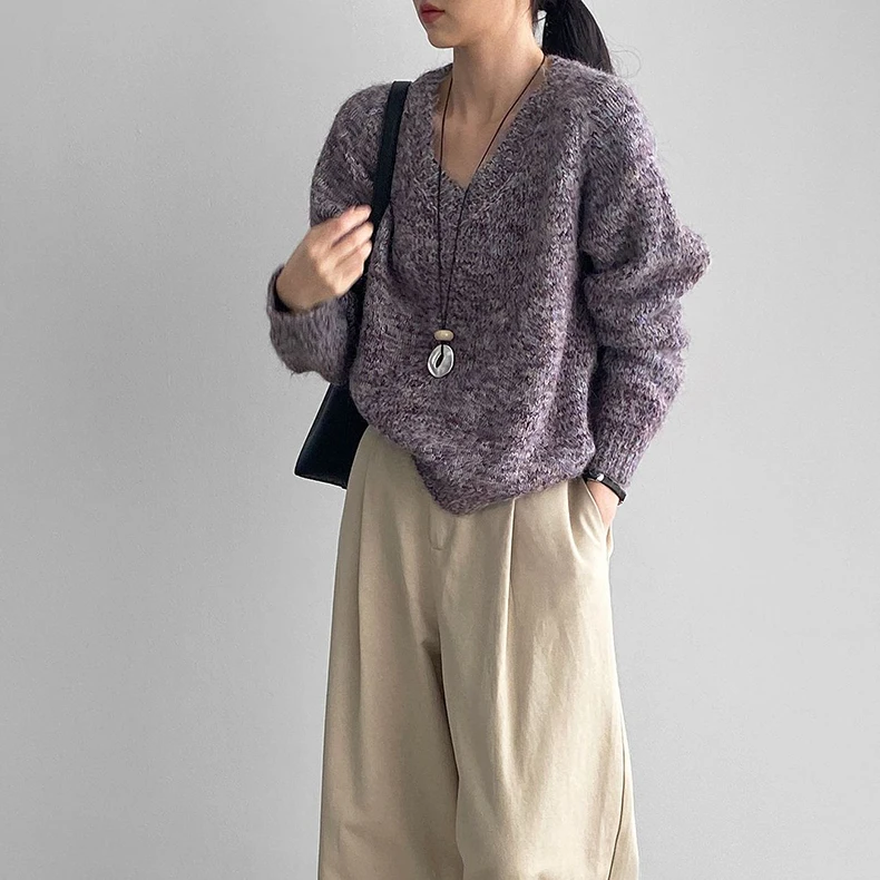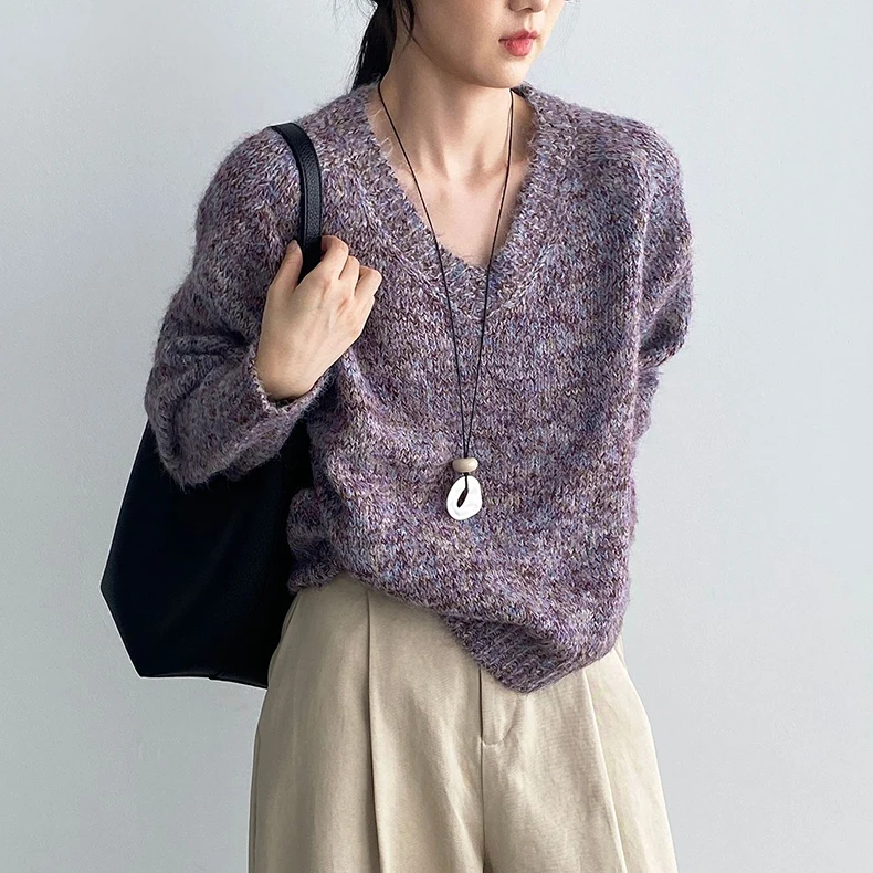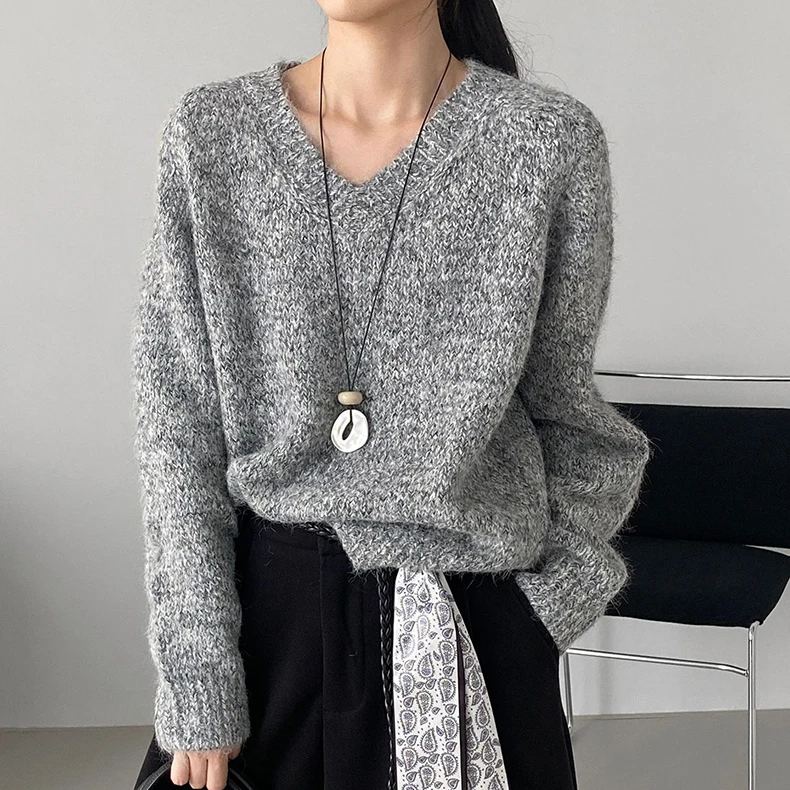 Korean-Style Casual Relaxed V-Neck Thin Soft Wool Blend Oversized Knit Sweater for Women Commuter-Chic All Seasons