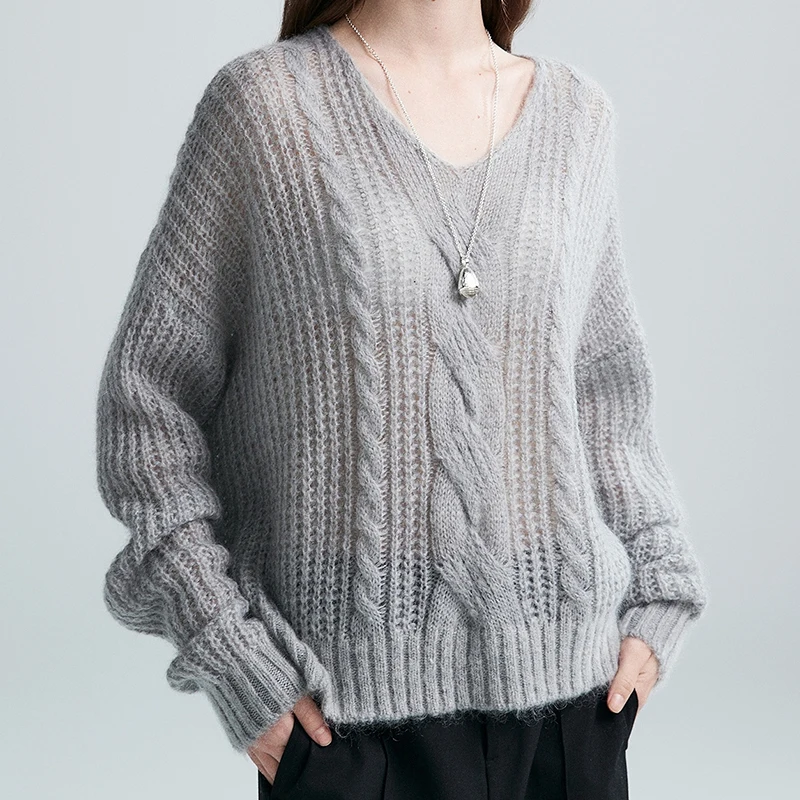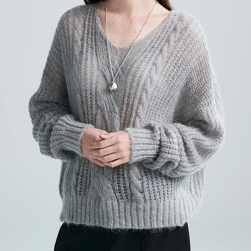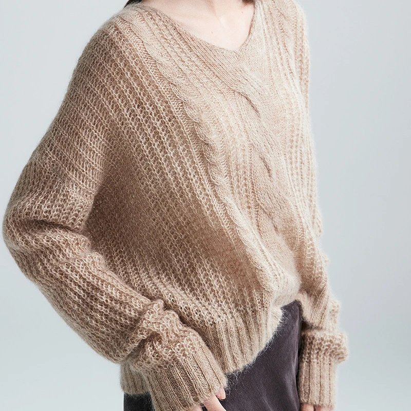 Women's Mohair V-Neck Anti-Pilling Thick Fuzzy-Feel Oversized Sweater for Fall/Winter Minimalist Wool Knit Breathable Casual