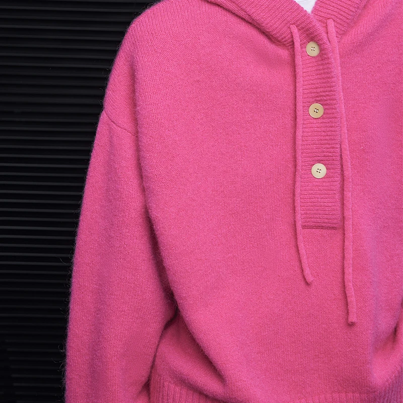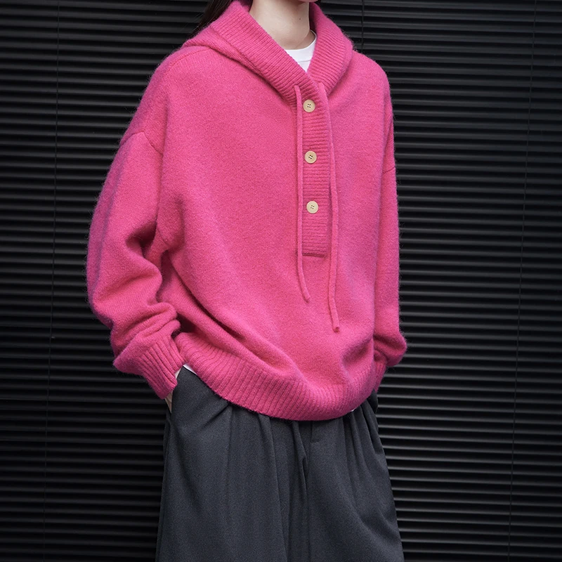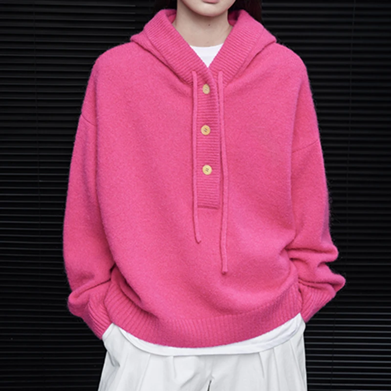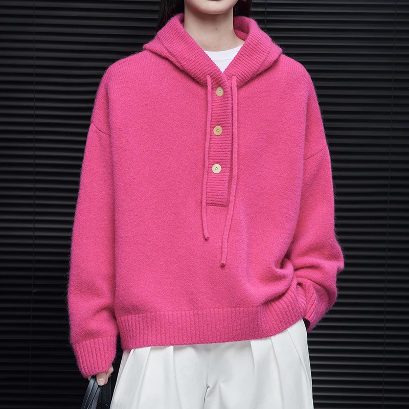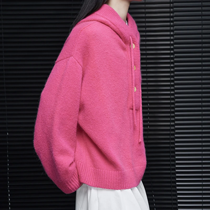 For Pink Hooded Knit Sweater for Women Fall Button Closure 100% Wool Thick Cardigan