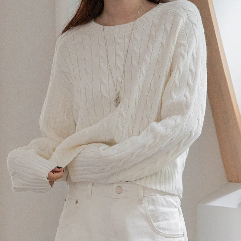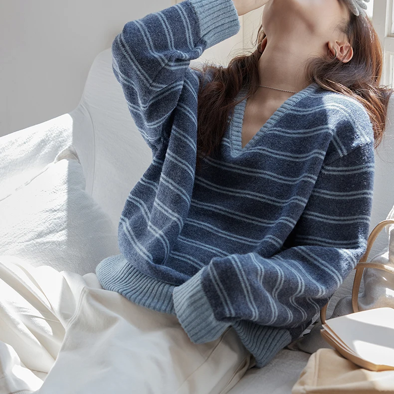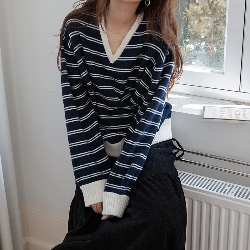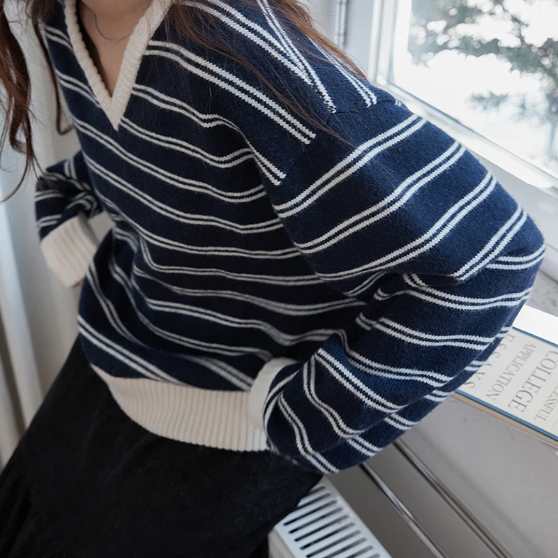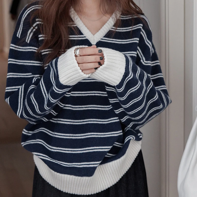 Women's Casual V-Neck Contrast-Striped Thick Sweater Loose-Fit Pullover Fall/Winter Drop-Shoulder Knit Top Relaxed Style