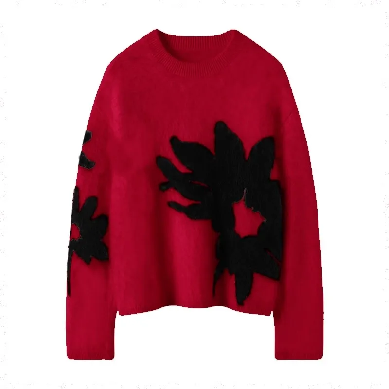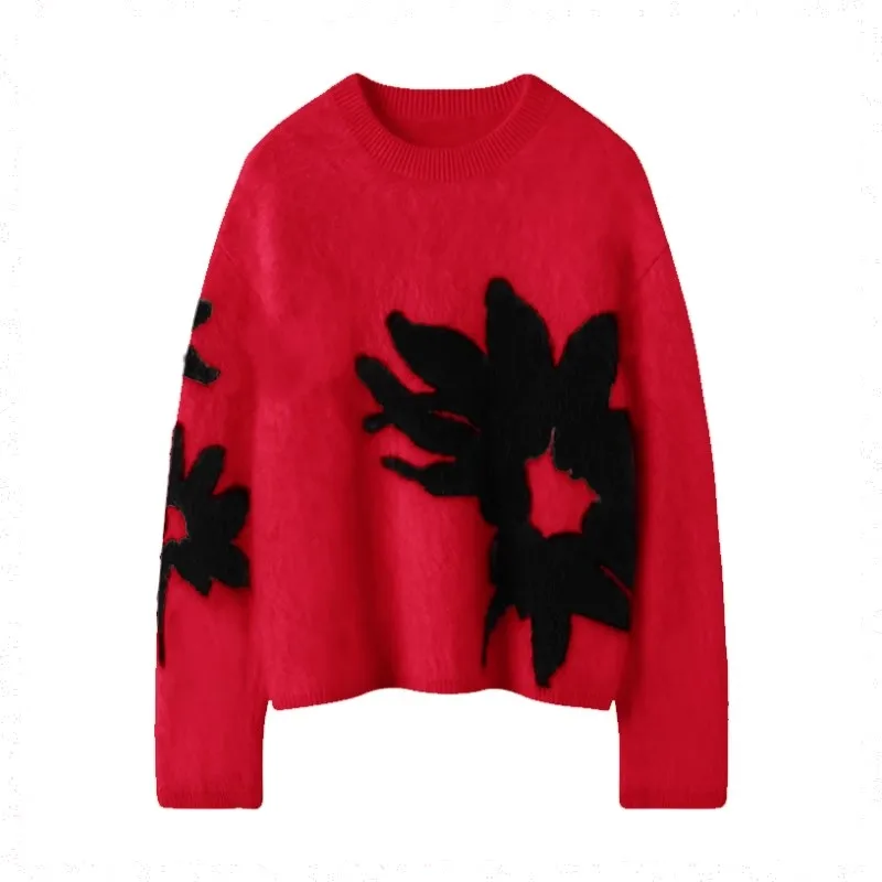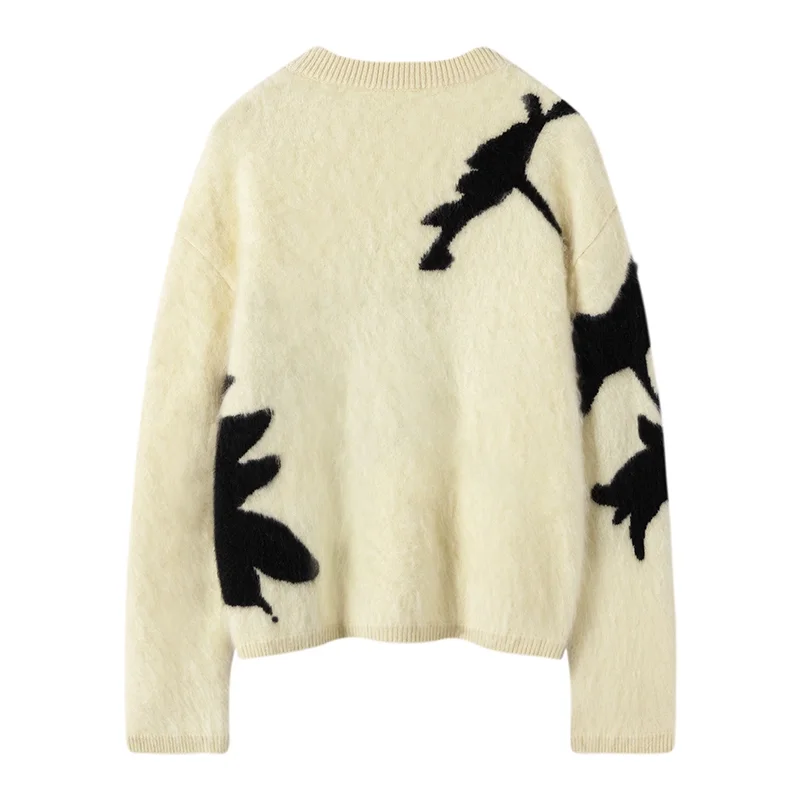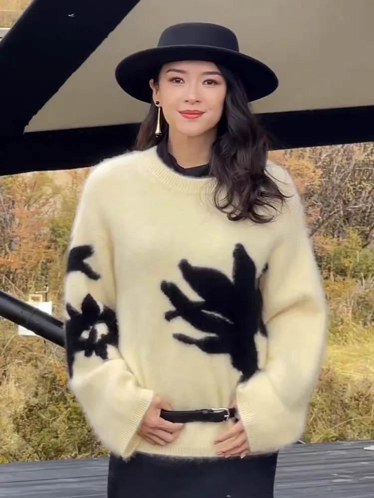 Women's Casual Autumn New Long-sleeved Knitted 100% Cashmere Flower Teddy Bear Pattern Thin Button Fashionable Loose Sweater