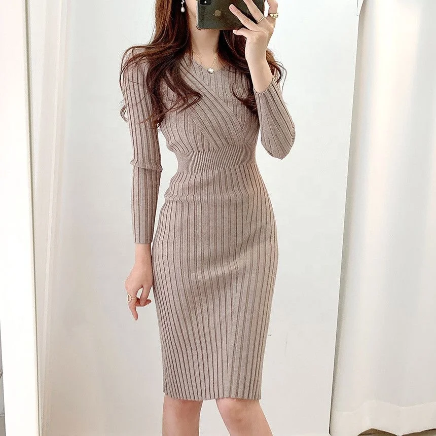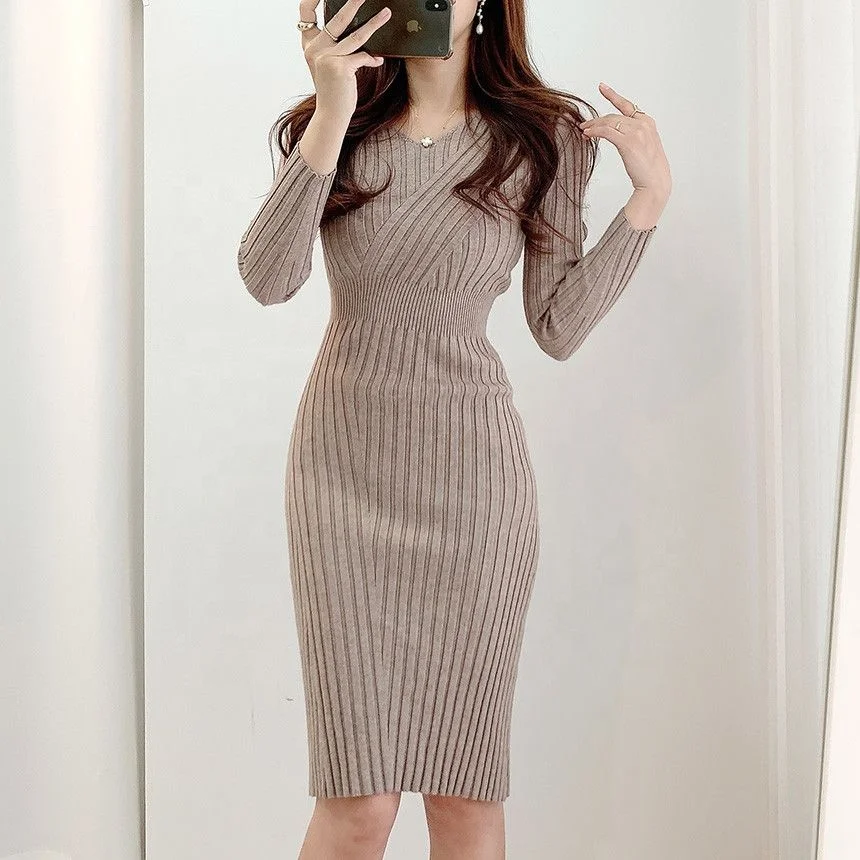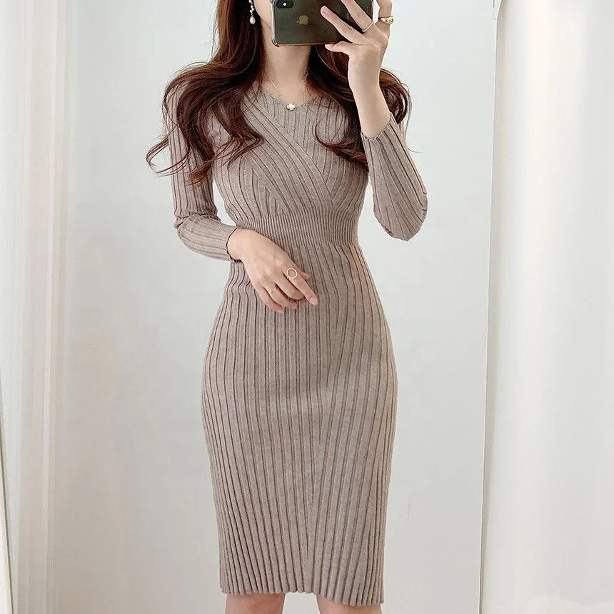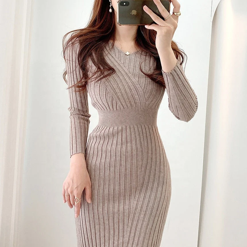 Autumn and Winter Slim Fit Knitted Hip-hugging Long Skirt V-neck Knitted Long-sleeved Dress