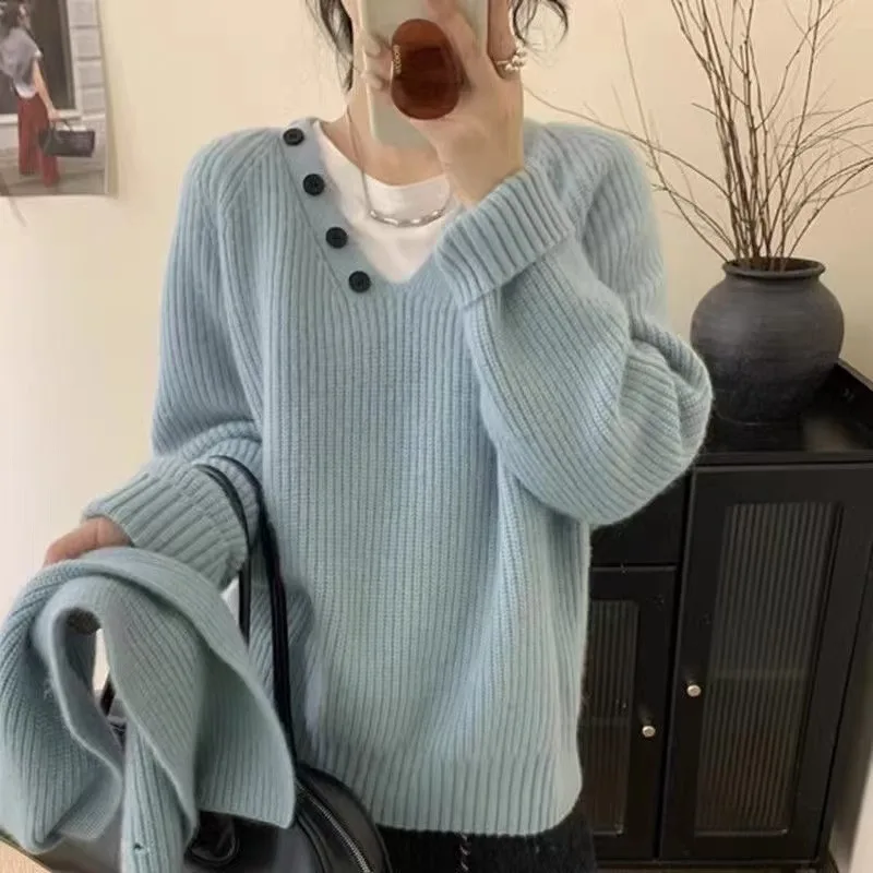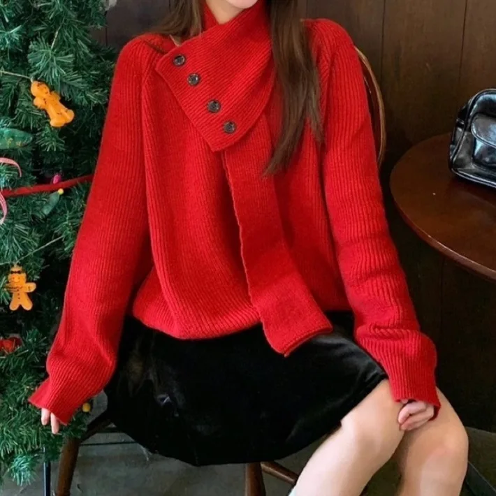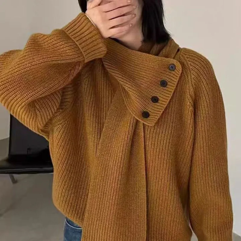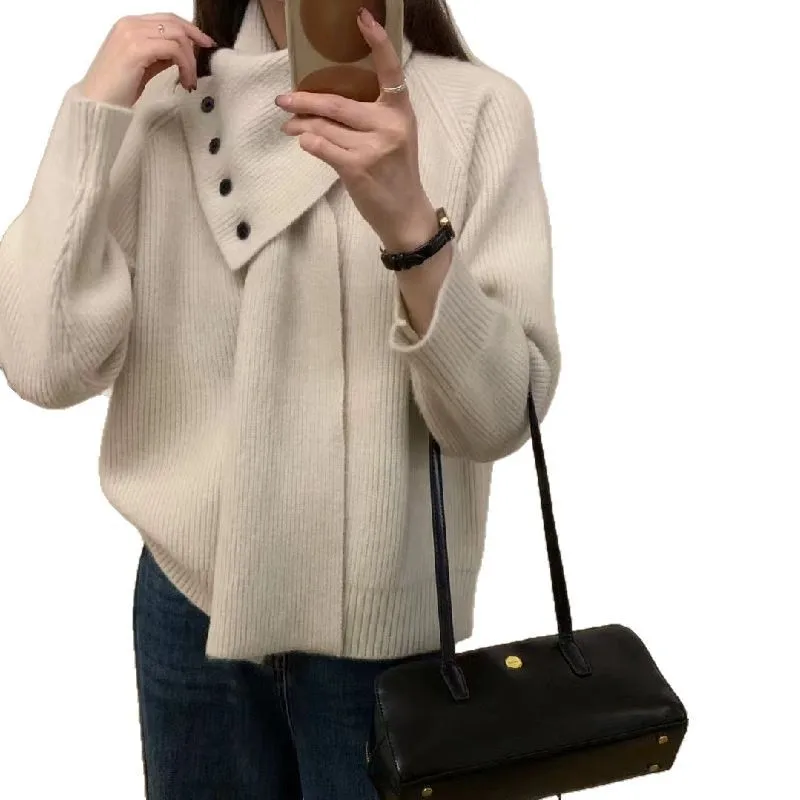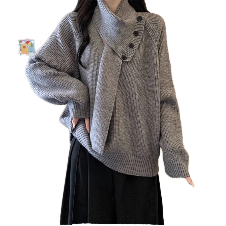 Knit Sweater for Women Winter Autumn Oversize Detachable Scarf with Button Decoration Grey Color