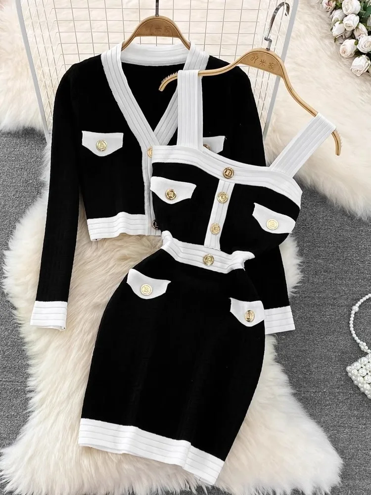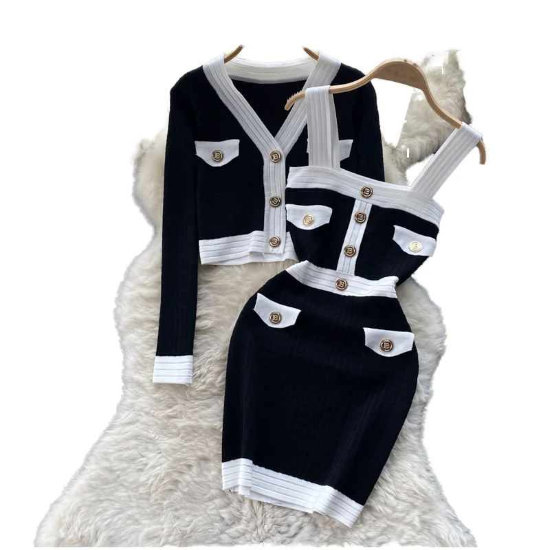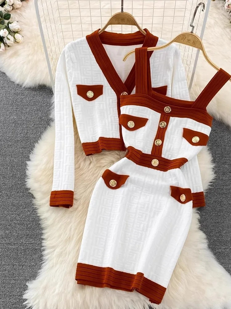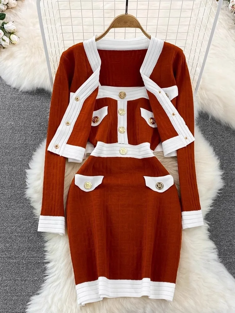 Fashion Sweater Elastic Waist Skirt Korean Spring Two-Piece Set for Women Autumn Solid Pattern Button Skinny