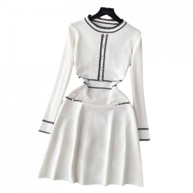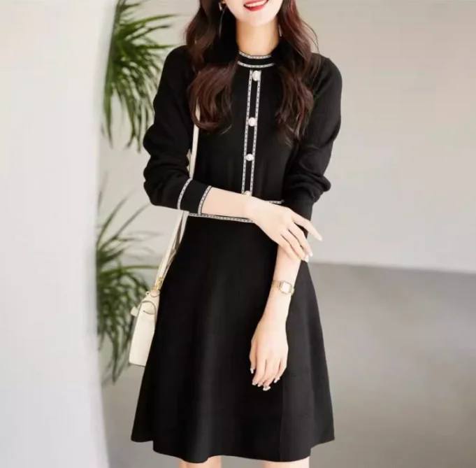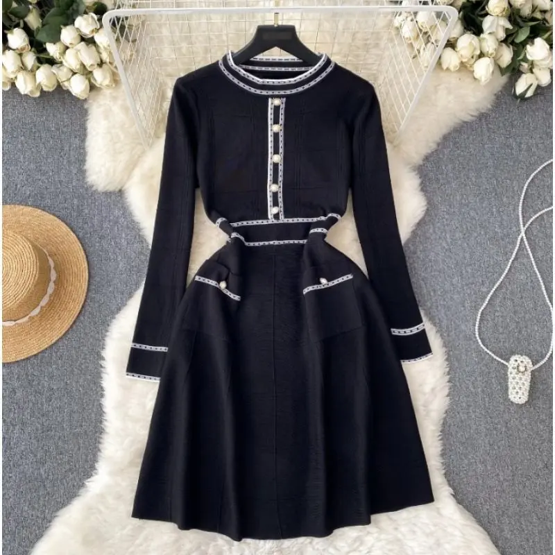 French Haute Couture Knit A-Line Dress Women's Summer Long Sleeve Natural Waist Simple Casual Black