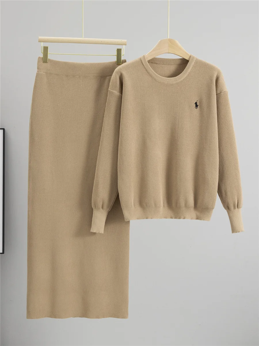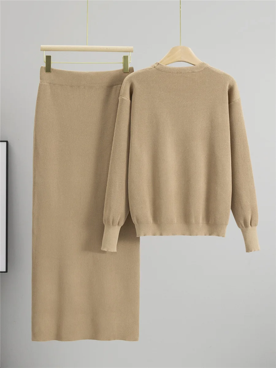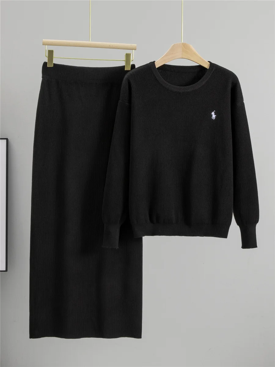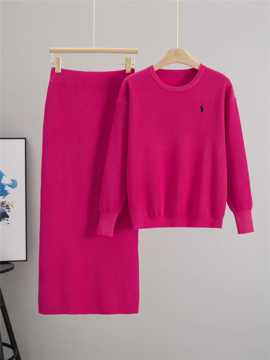 Women's New Design Autumn Knitted Suit Solid Pattern O-Neck Top Slit Skirt Set with Embroidered Technics Contrasting Colors