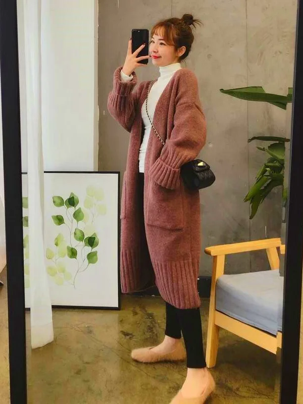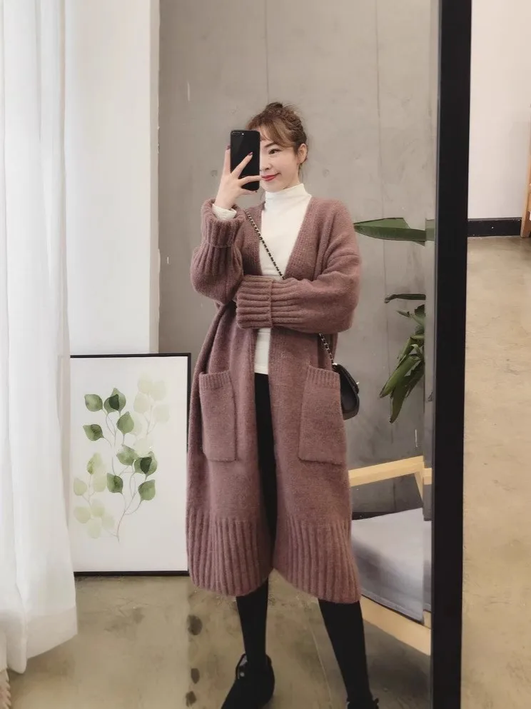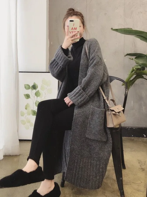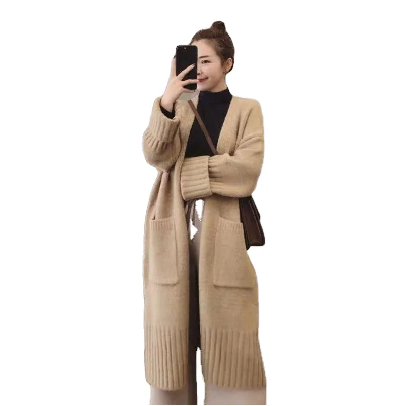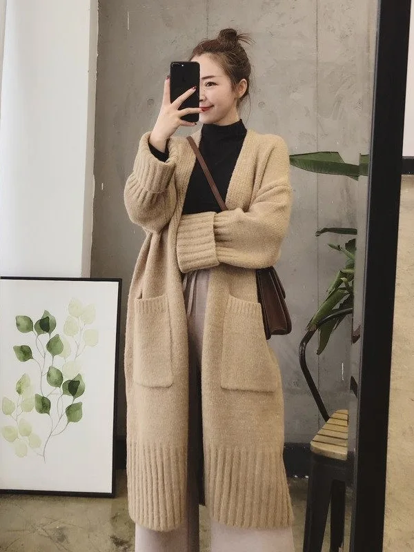 Women's Spring Autumn Knitted Cardigan New Korean Style Loose Lazy Long Sweater Jacket with Appliques Hollow Out Pattern