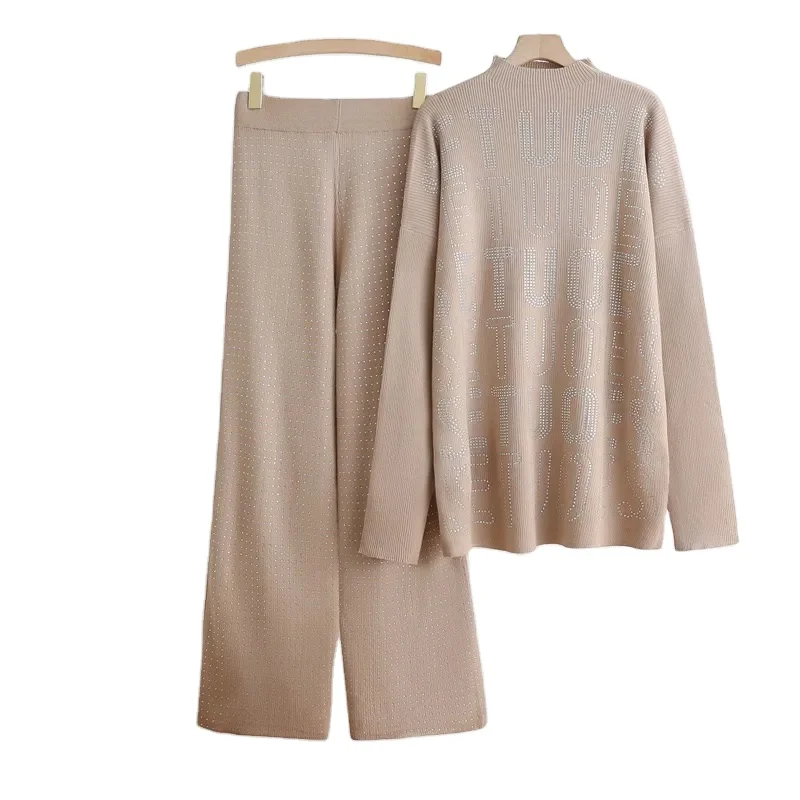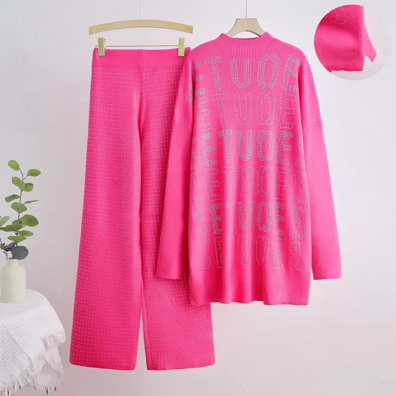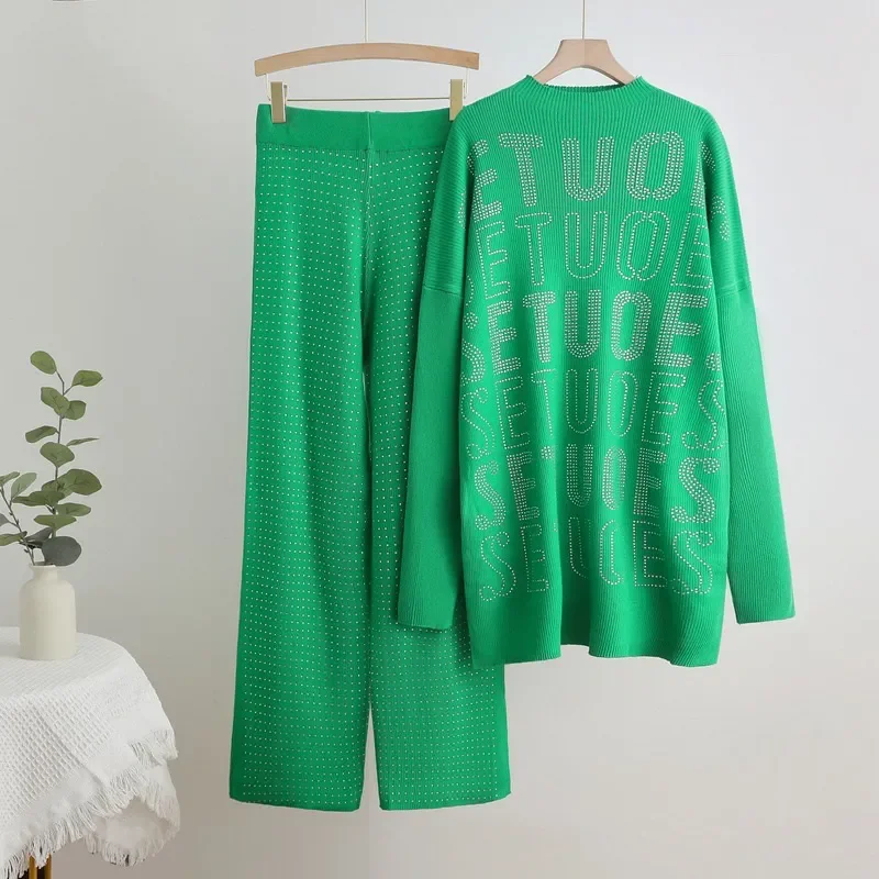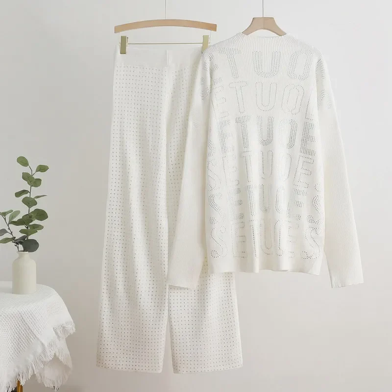 Summer Women's New Casual Home Suit Women's Solid Color Wide-leg Pants Loose Knit Long Sleeve Tassel Knit Two-Piece Set