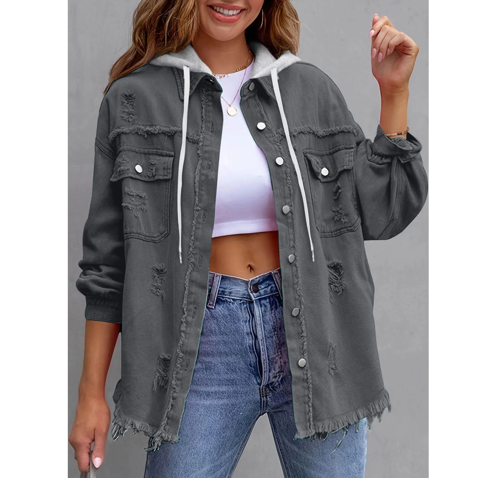2026 Women's Denim Hooded Jacket, Solid Color Loose Jacket, Perforated Long Sleeved Denim Shirt