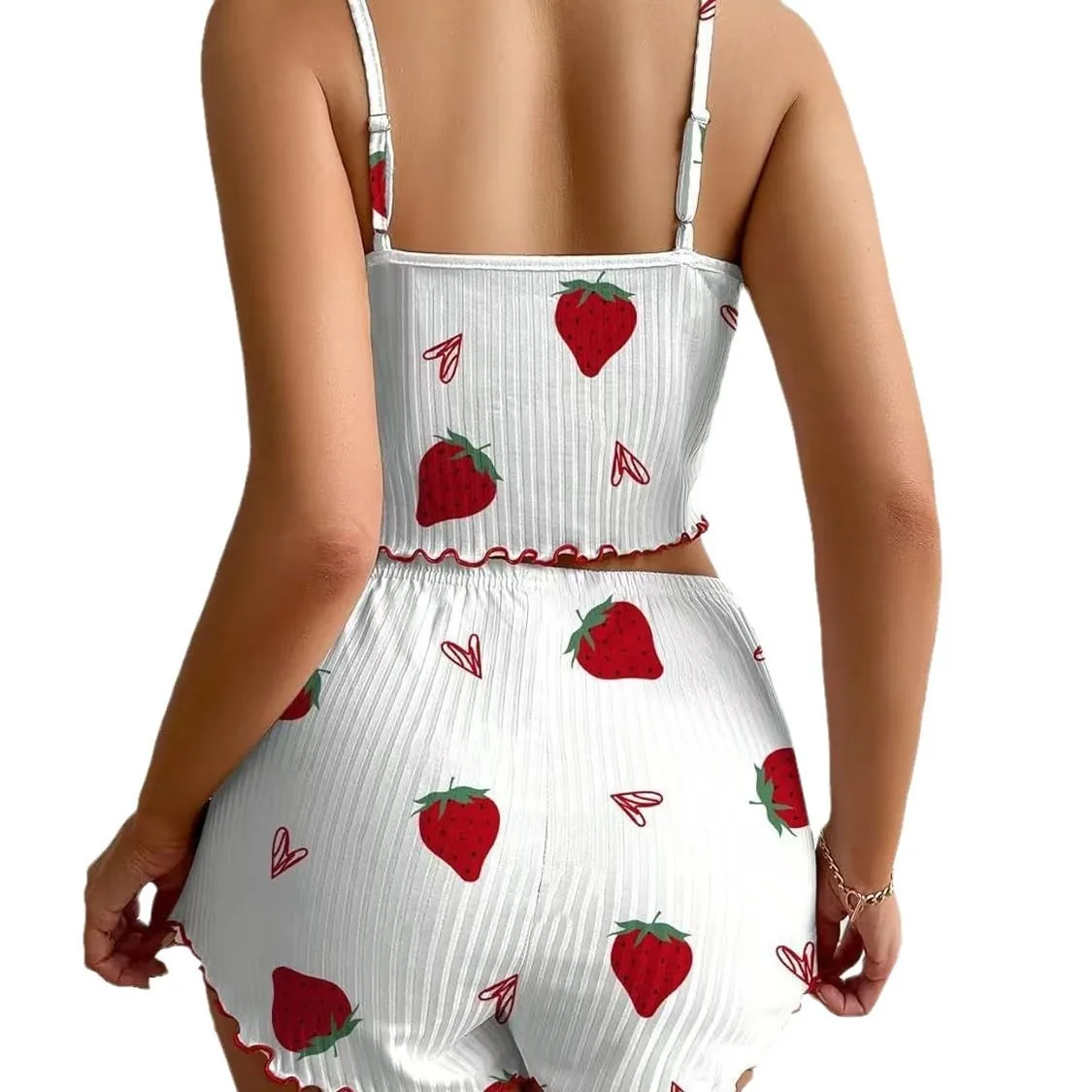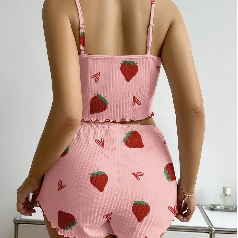 2026 Women's Pajama Pit Bar Fashion Set Design Sense Strawberry Printed Sweet Strap Shorts