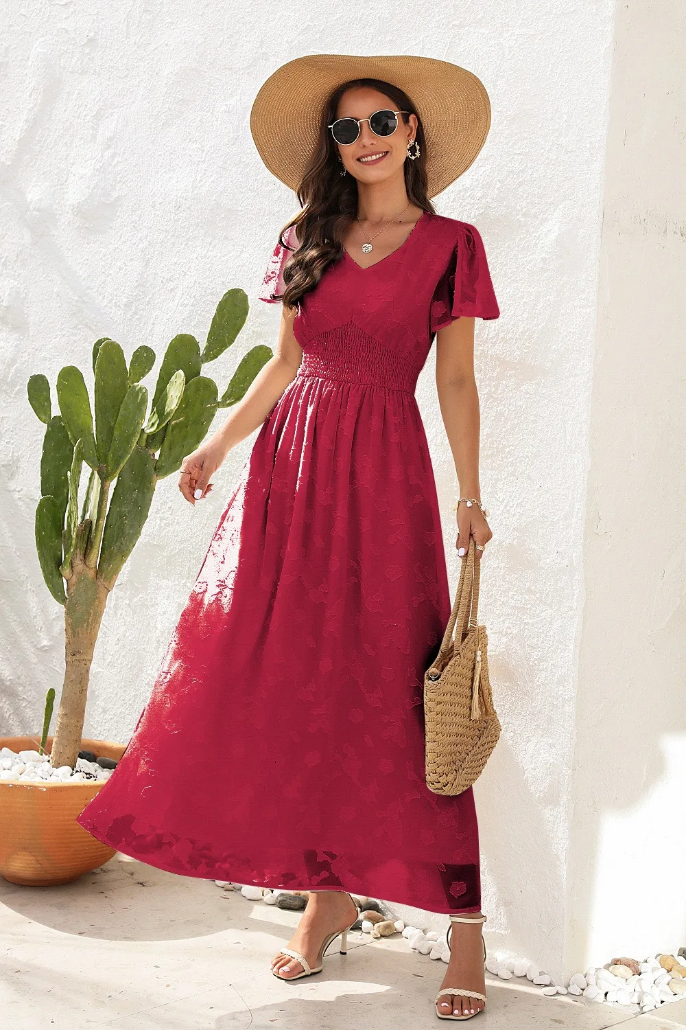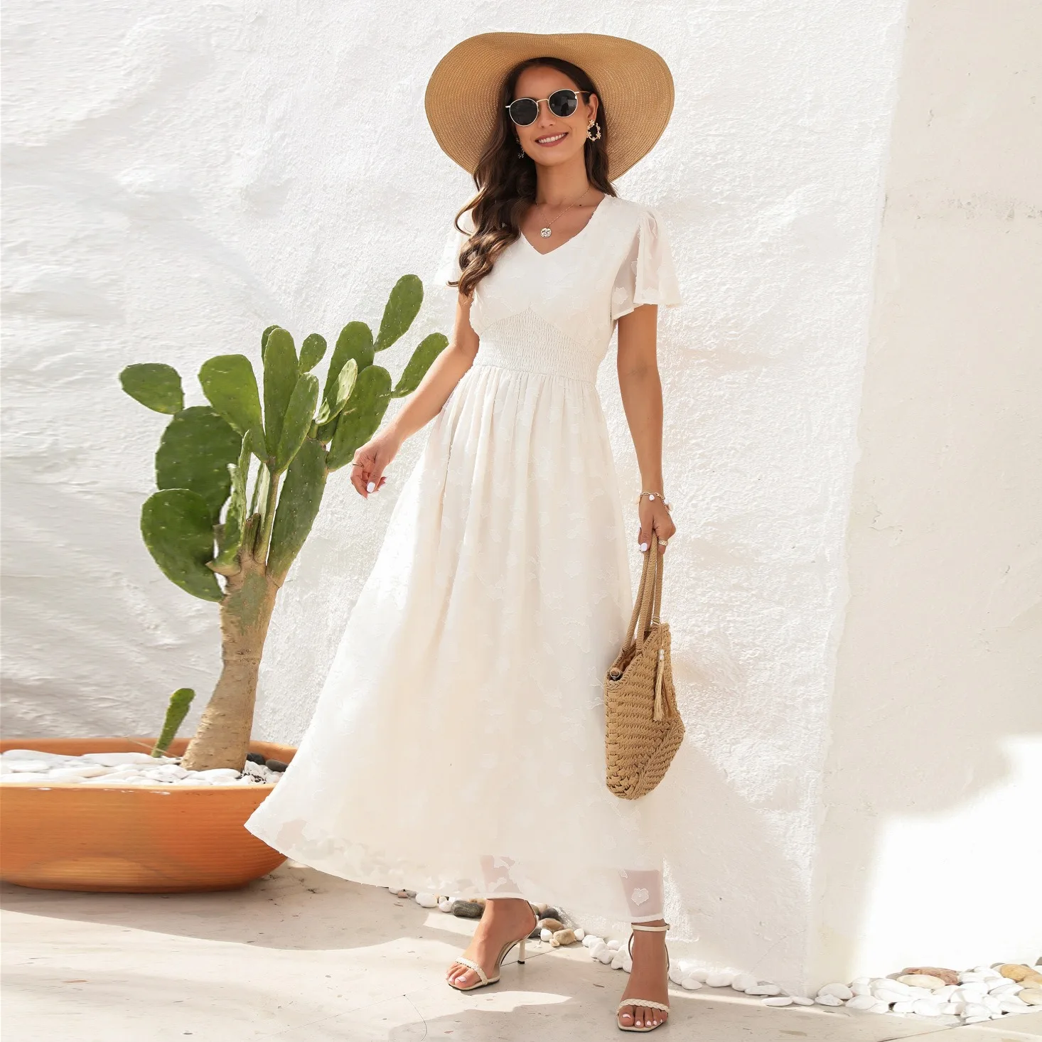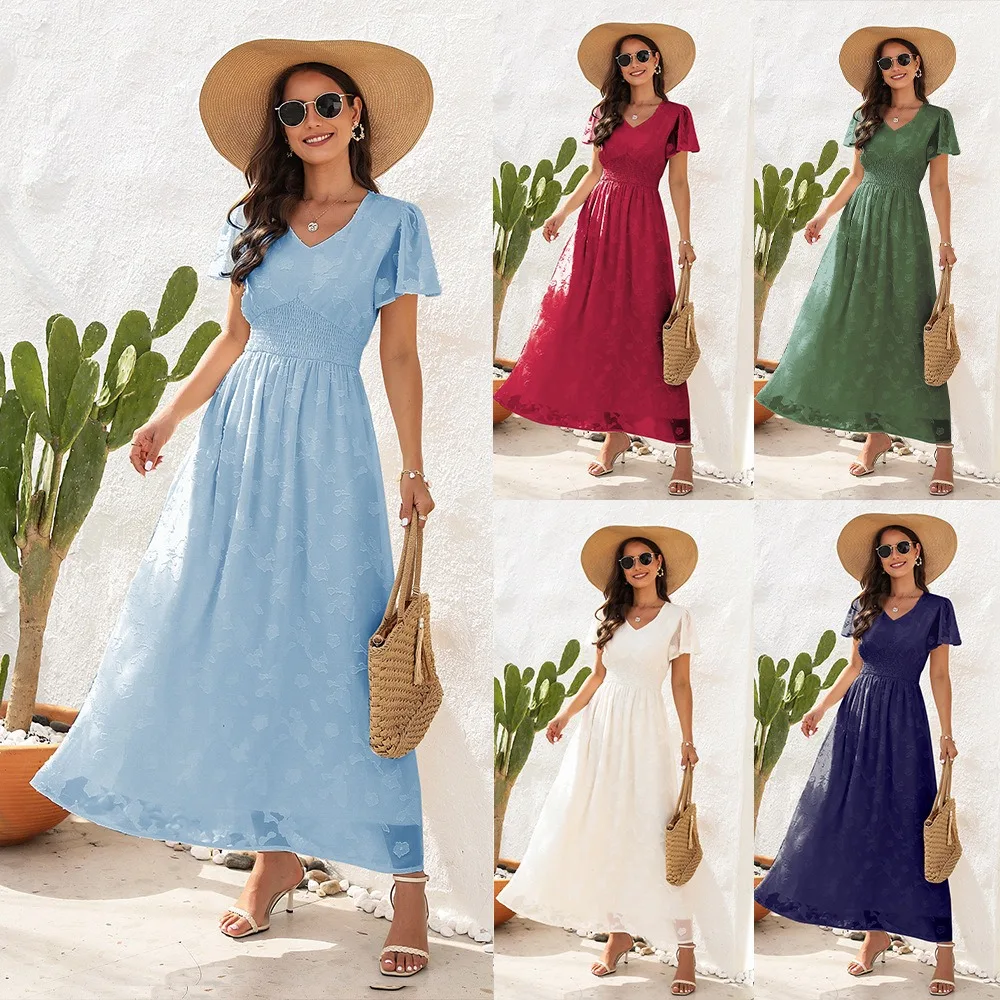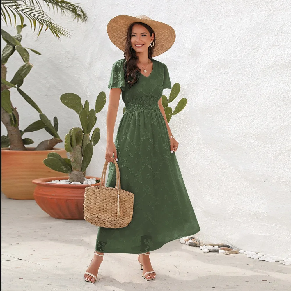 2026 V-neck Waist Cinched Dress Jacquard Mid Length Short Sleeved Dress for Vacation and Travel