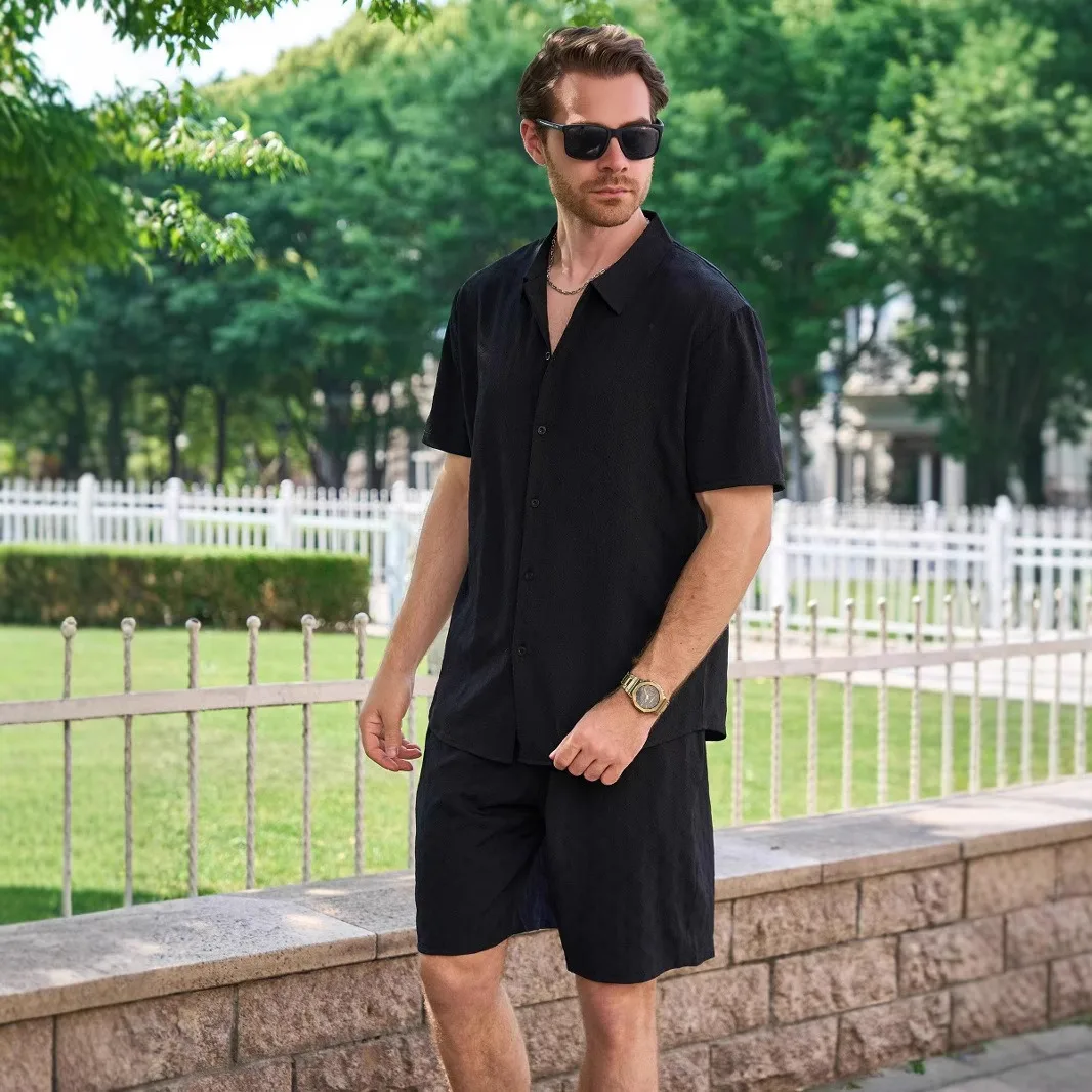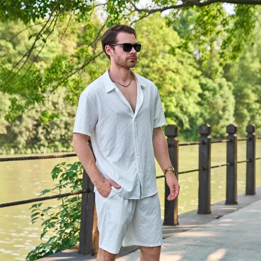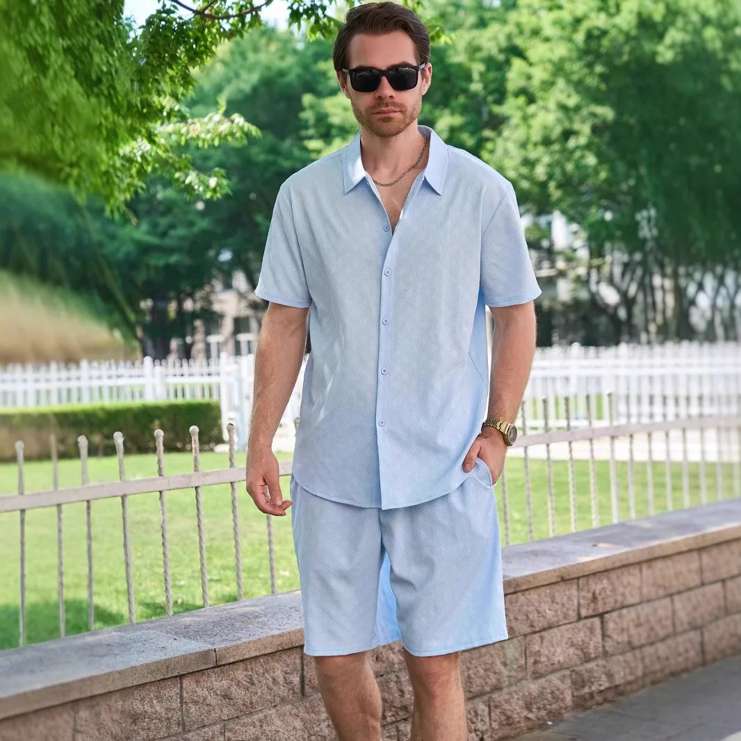 2025 2025 Summer New Men's Jacquard Collar Cardigan Short Sleeve Shirt Shorts Set
