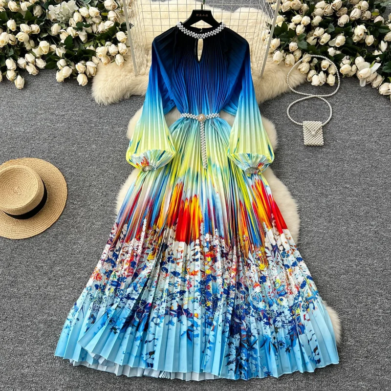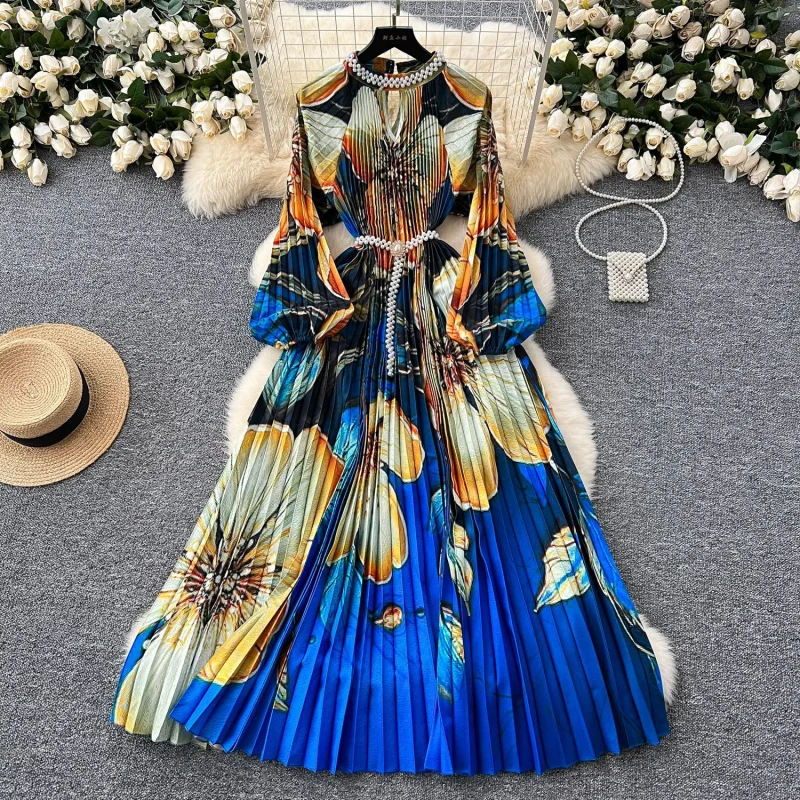 New Style Women's O-Neck Tunic Pleated Maxi Dress Empire Printed Beaded Lace with Long Sleeve Casual Draped Breathable