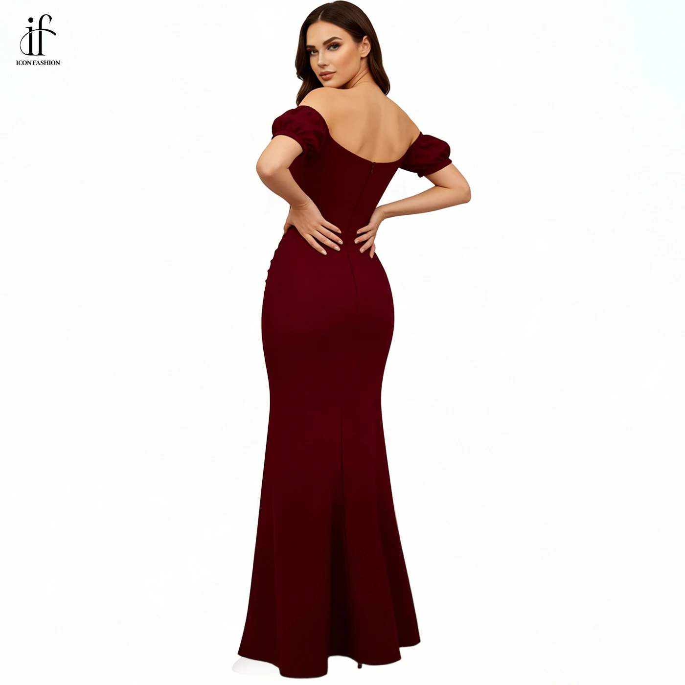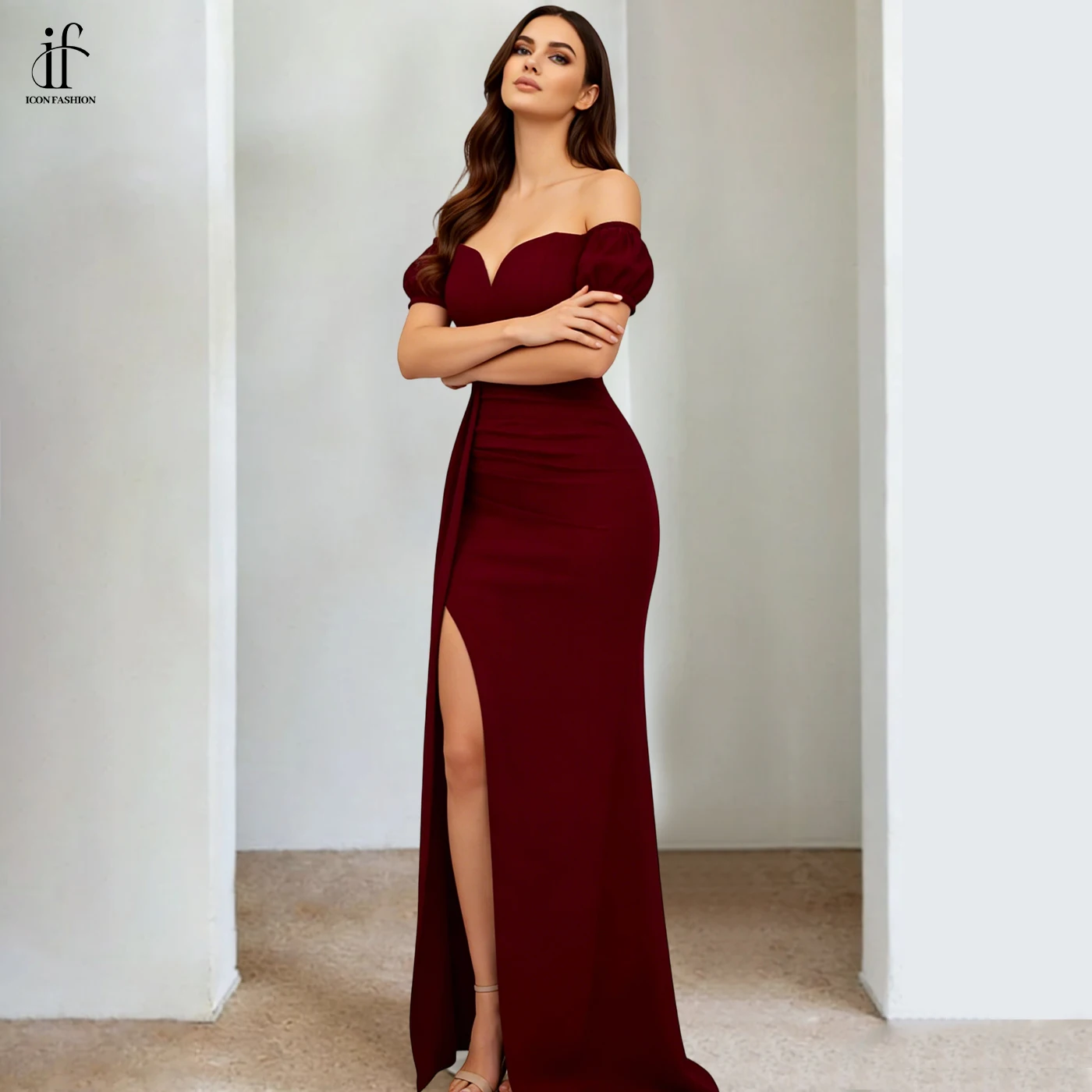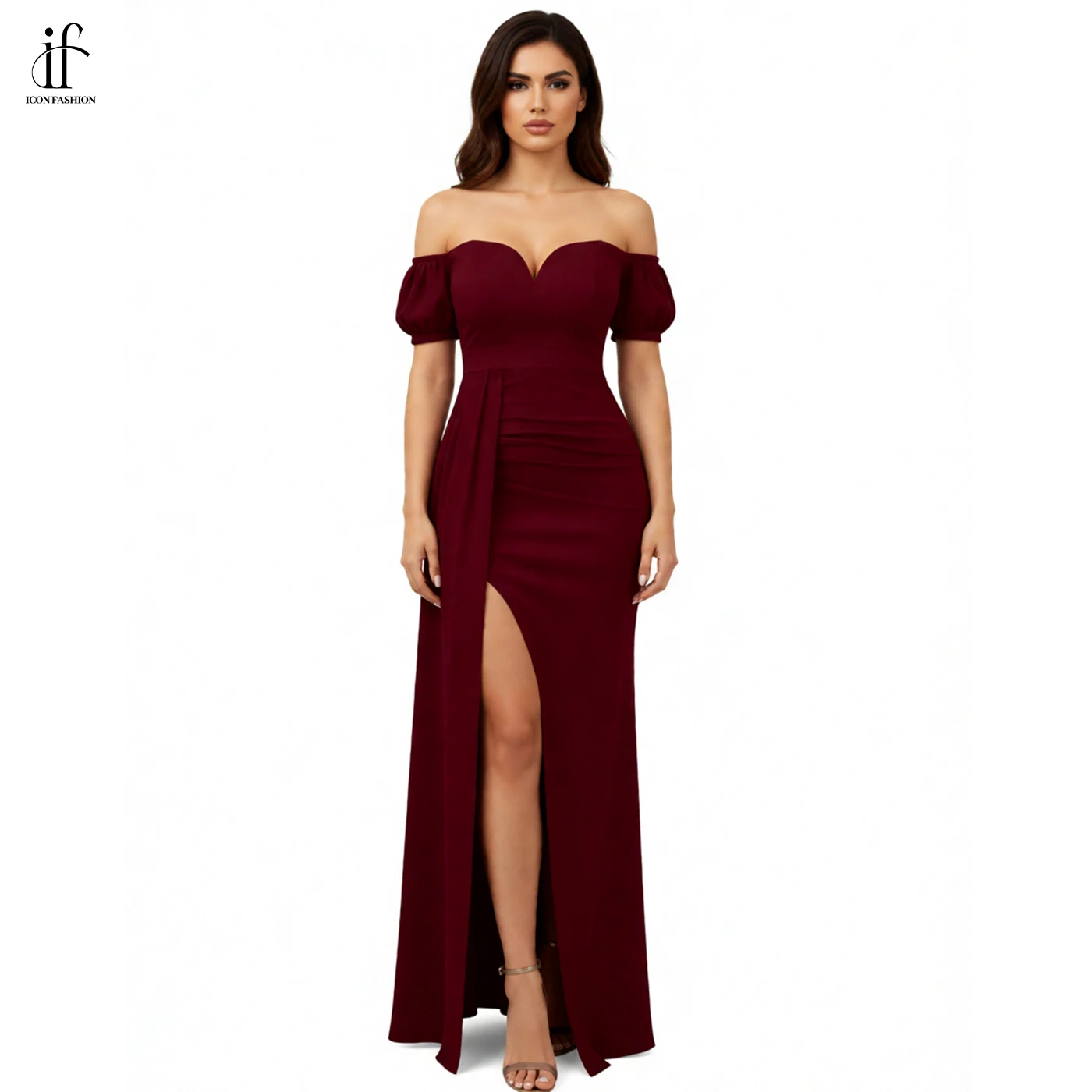 Wine Red Off Shoulder Evening Gown Bubble Sleeve Velvet Slit Elegant Party Dresses Women Custom Clothing Brand