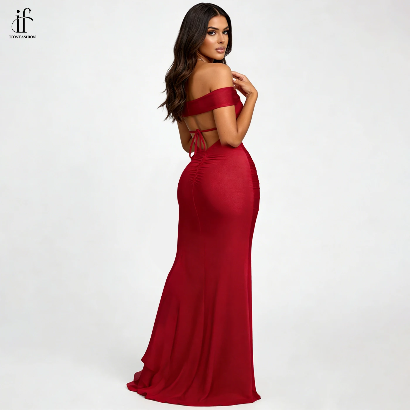 ZYHT 73905 Dusty Rose Off-The-Shoulder Long Sleeve Stretch Jersey Dress Ruched Bodice Floor Length Fish Tail Maxi Dress