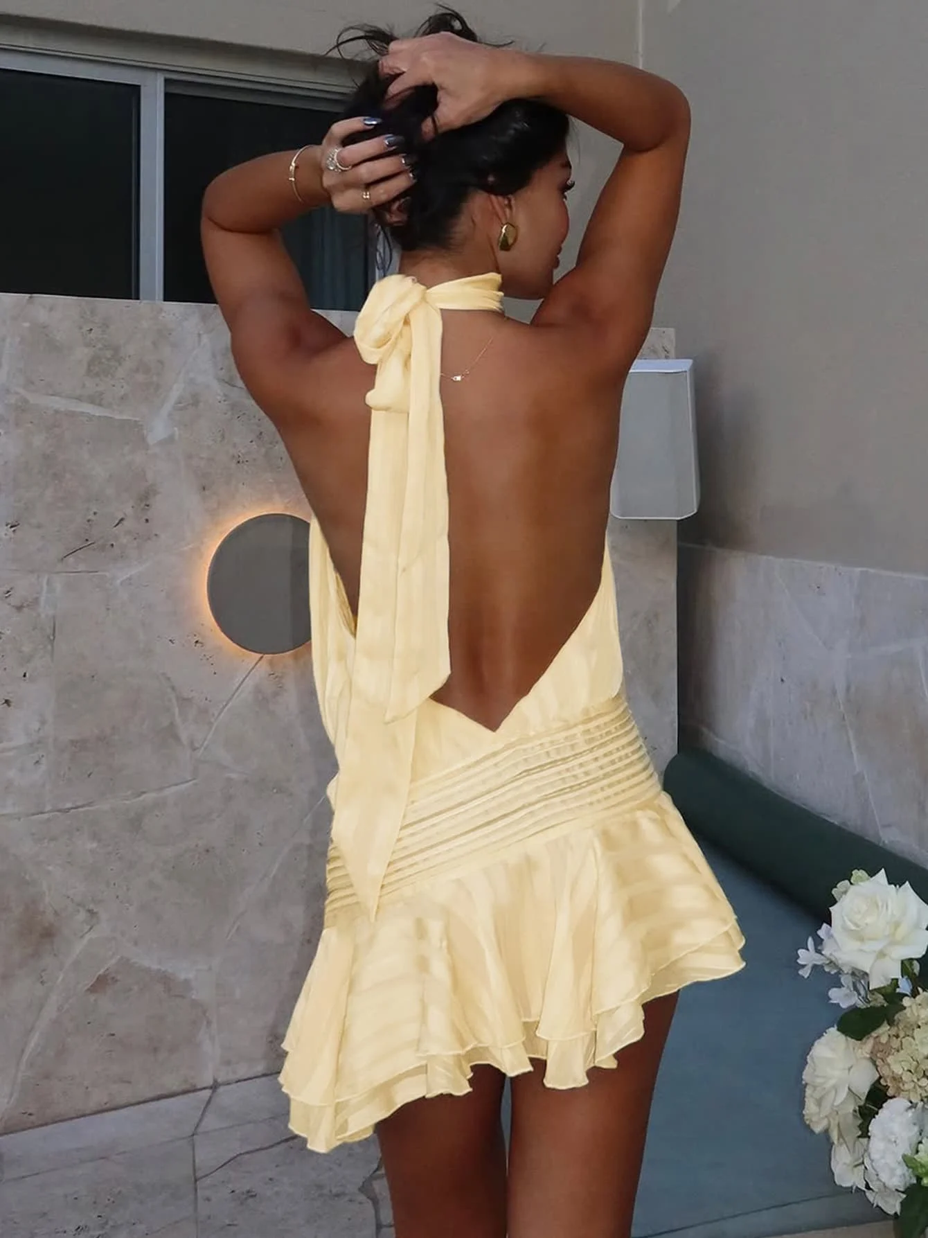Causal Summer Yellow Halter Neck Backless Chiffon Summer Sexy Party Short Mini Dress for Women Ladies