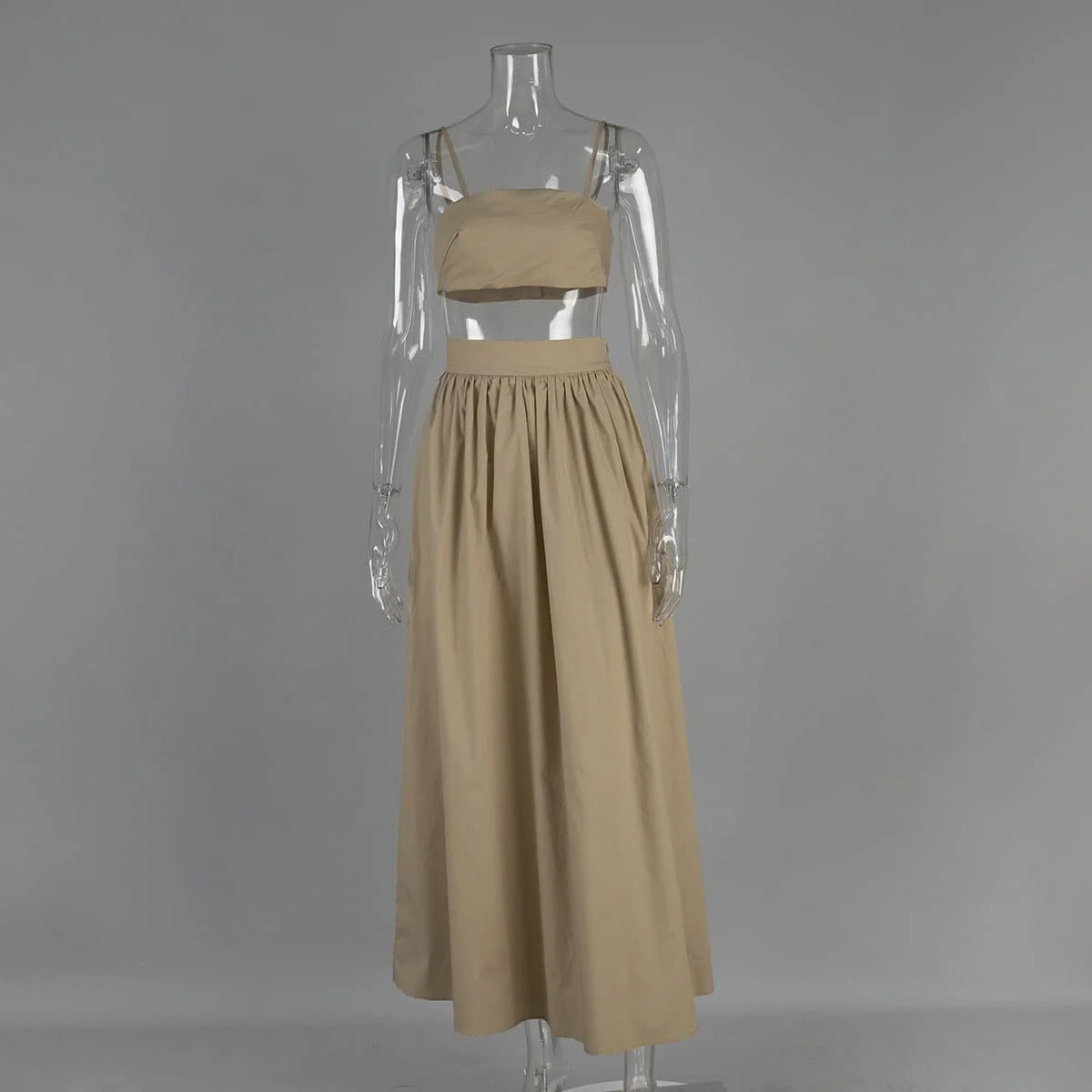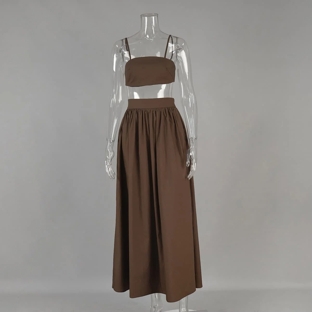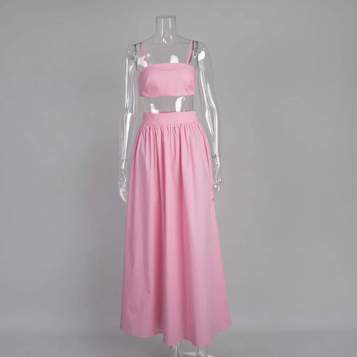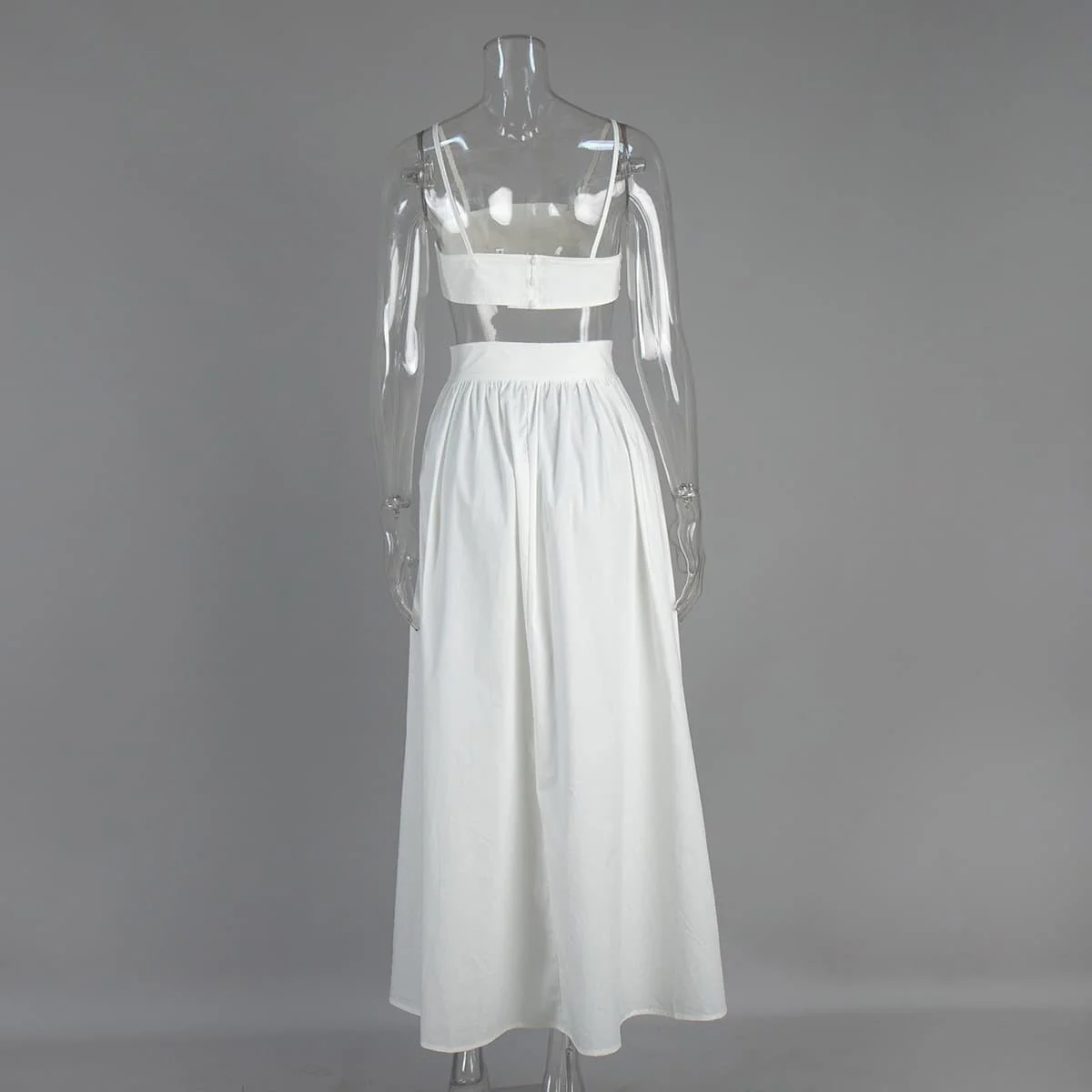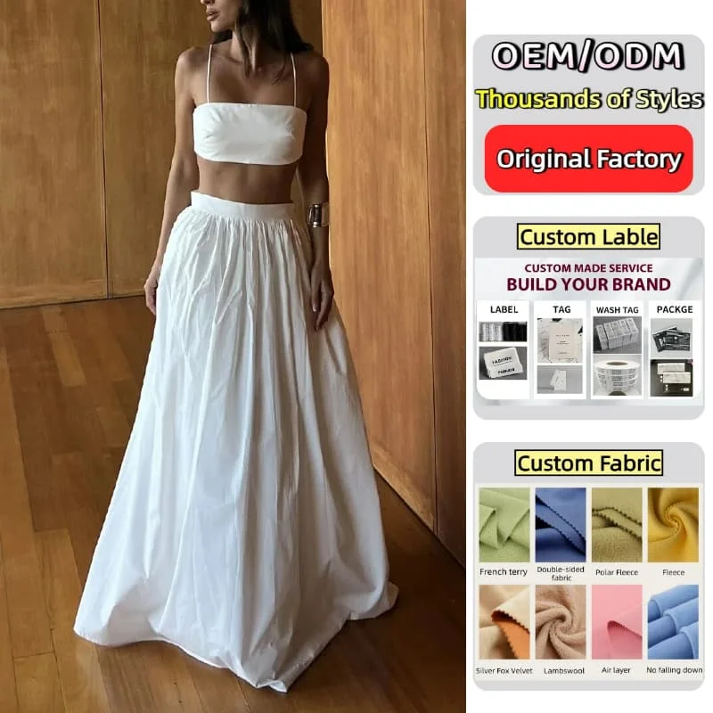 100% Cotton Two Piece Summer Clothes White Spaghetti Straps Bustier Cami Crop Top Pocket Maxi Flowy Skirt Set Co Ord for Women