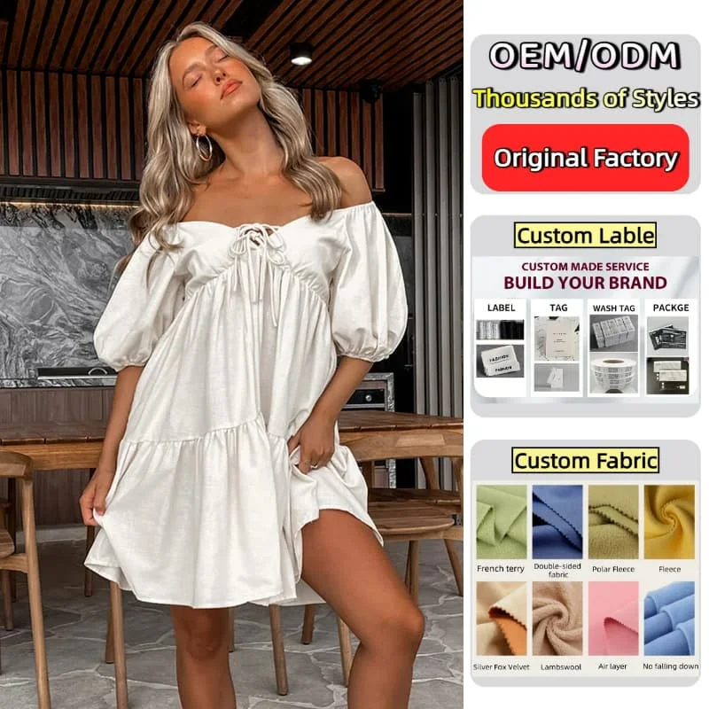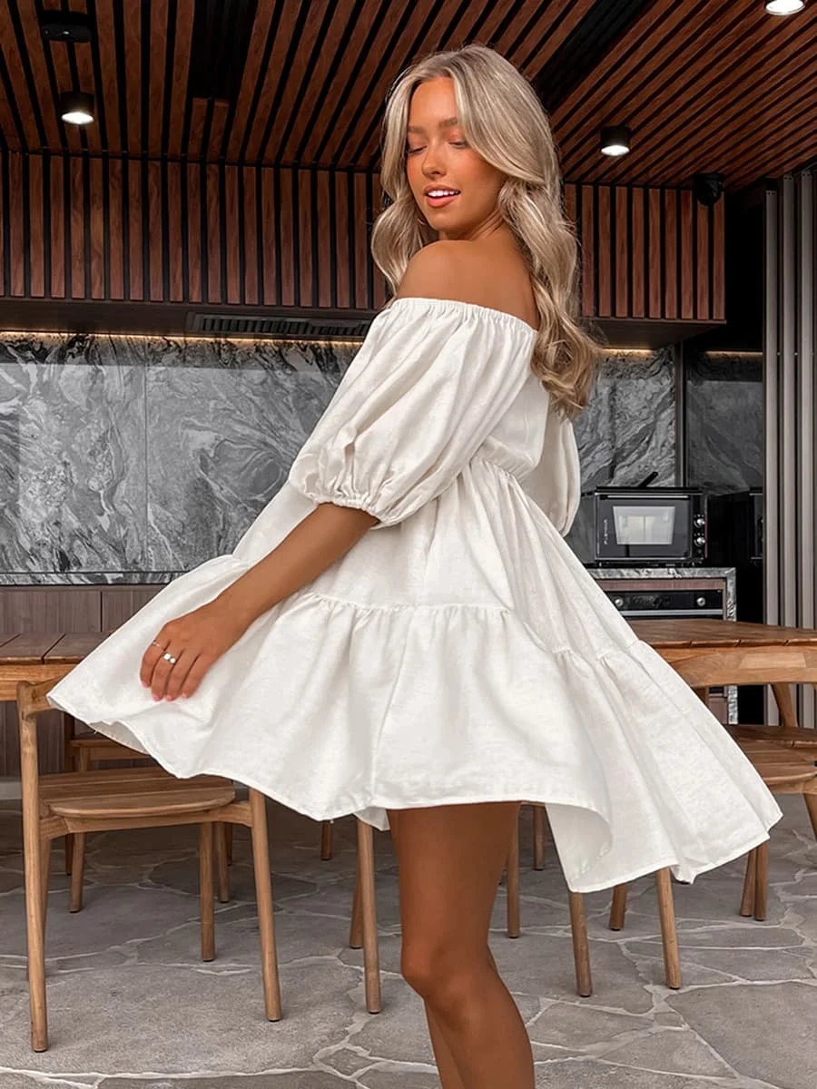 White Off Shoulder Puff Sleeve Ruffle Sundress Boho Sweetheart Neck Babydoll Mini Dress Summer Clothes for Women