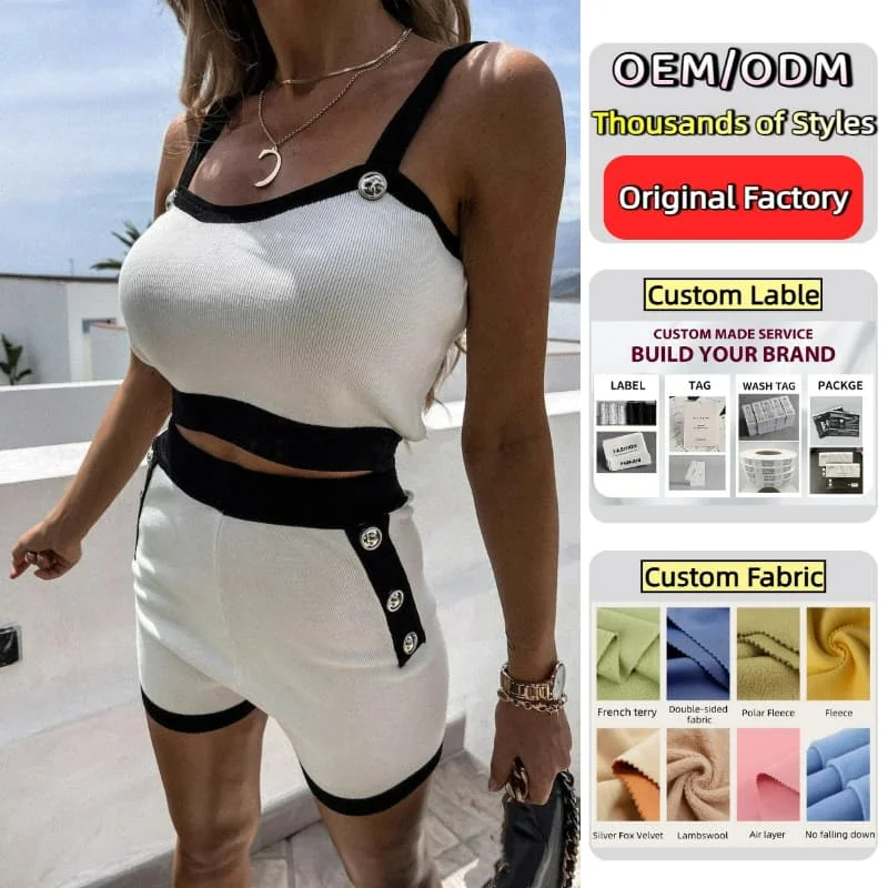 Two Piece White Custom logo Summer Clothes Ribbed Sleeveless Crop Top and Shorts Coords Knit Matching Set for Women
