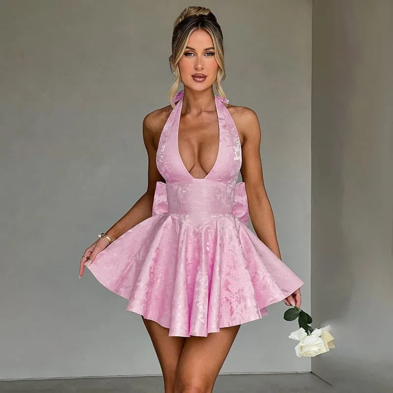 Big Bow Corset Summer Jacquard Halter Open Back Deep v Neck Elegant Cocktail Short Mini Skater Dress for Women Ladies