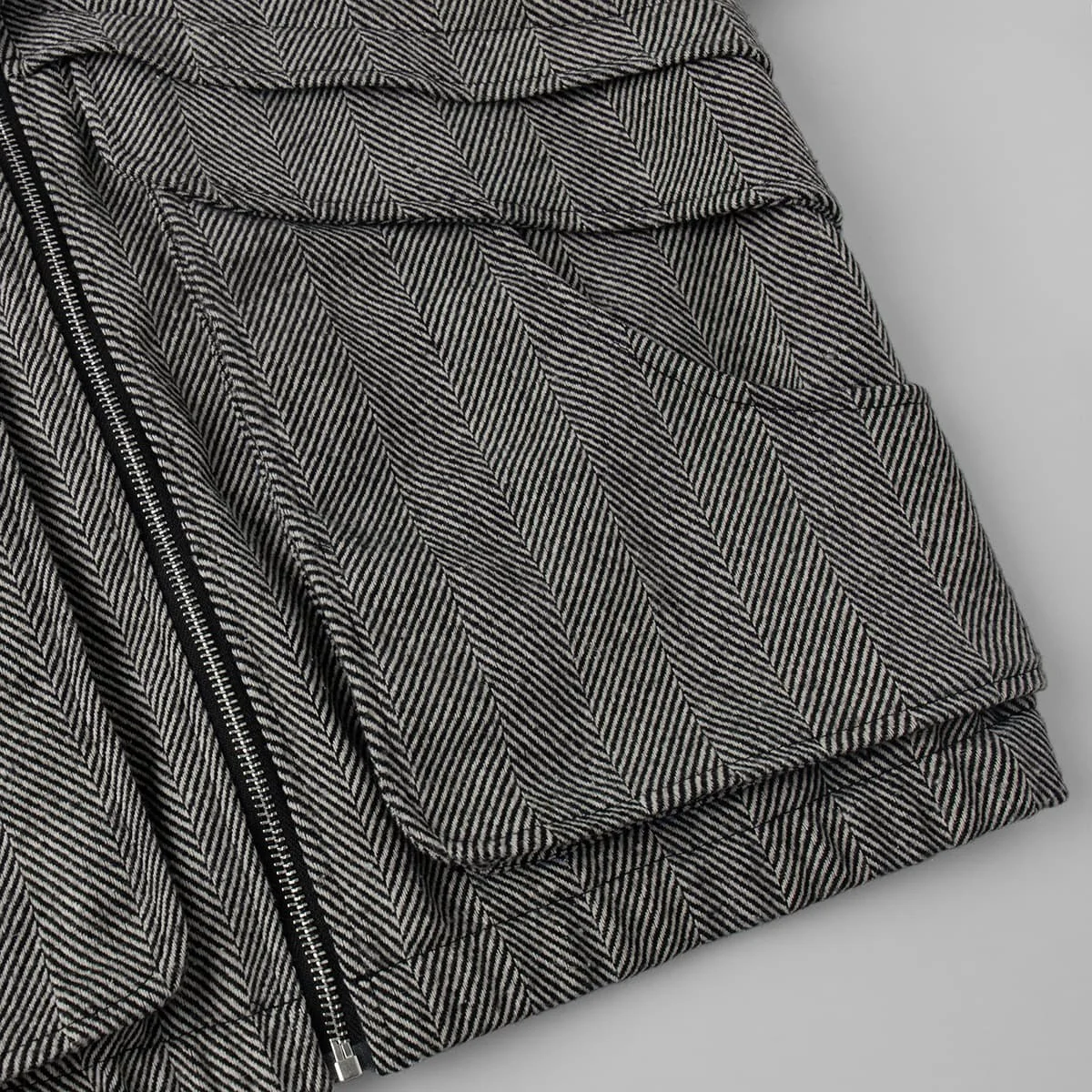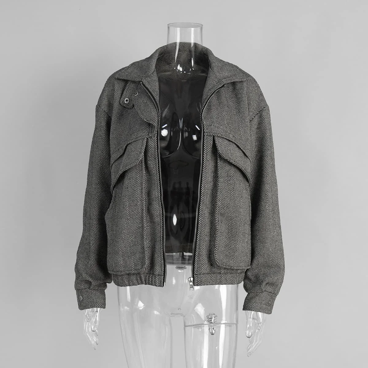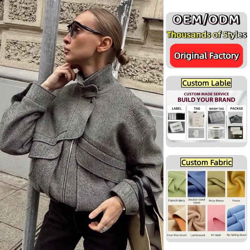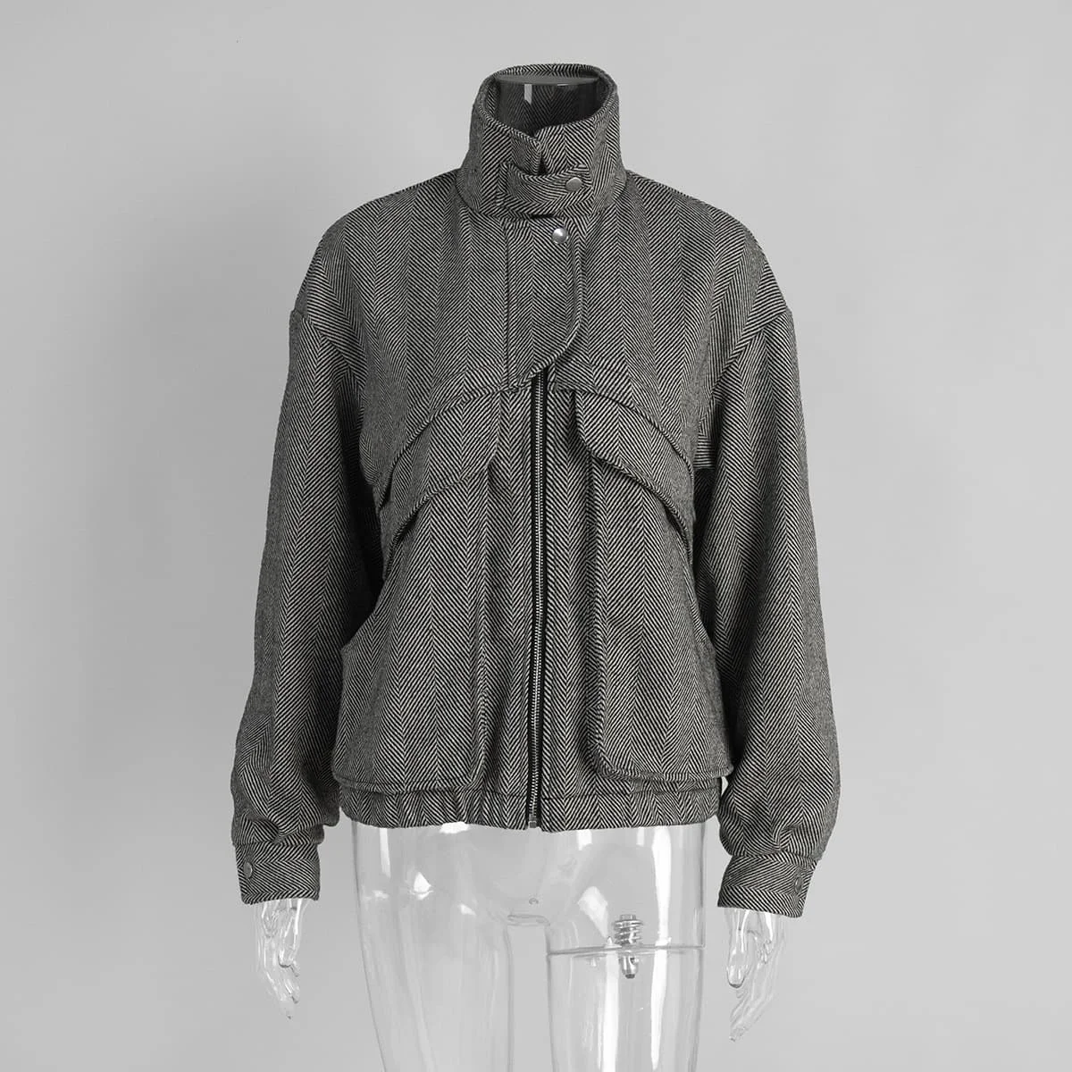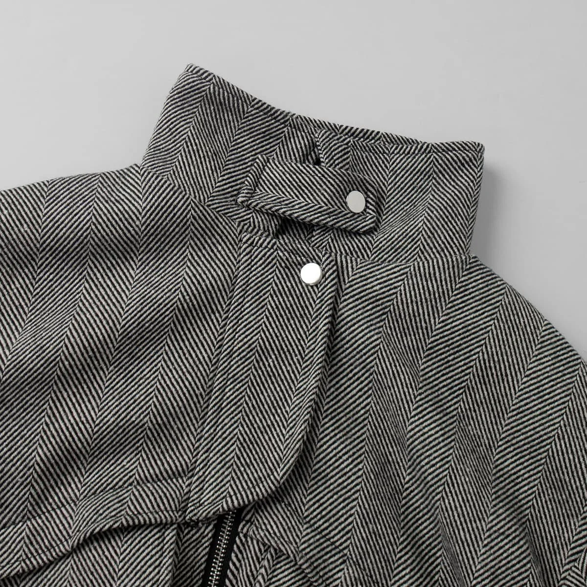 Wool Blend Herringbone Stripe Crop Bomber Jacket Custom Fall Winter Clothes Stand Collar Zip up Outerwear for Women Ladies