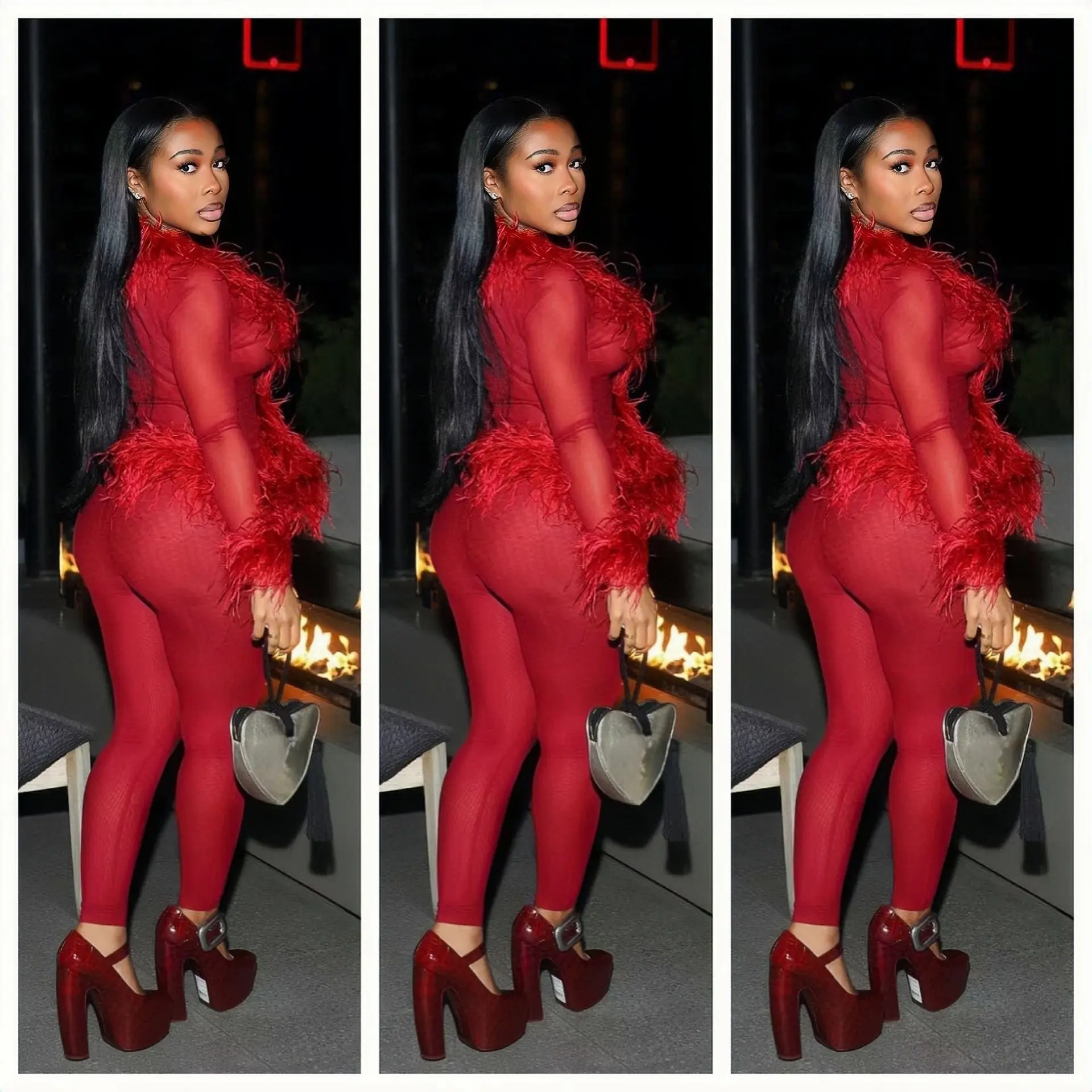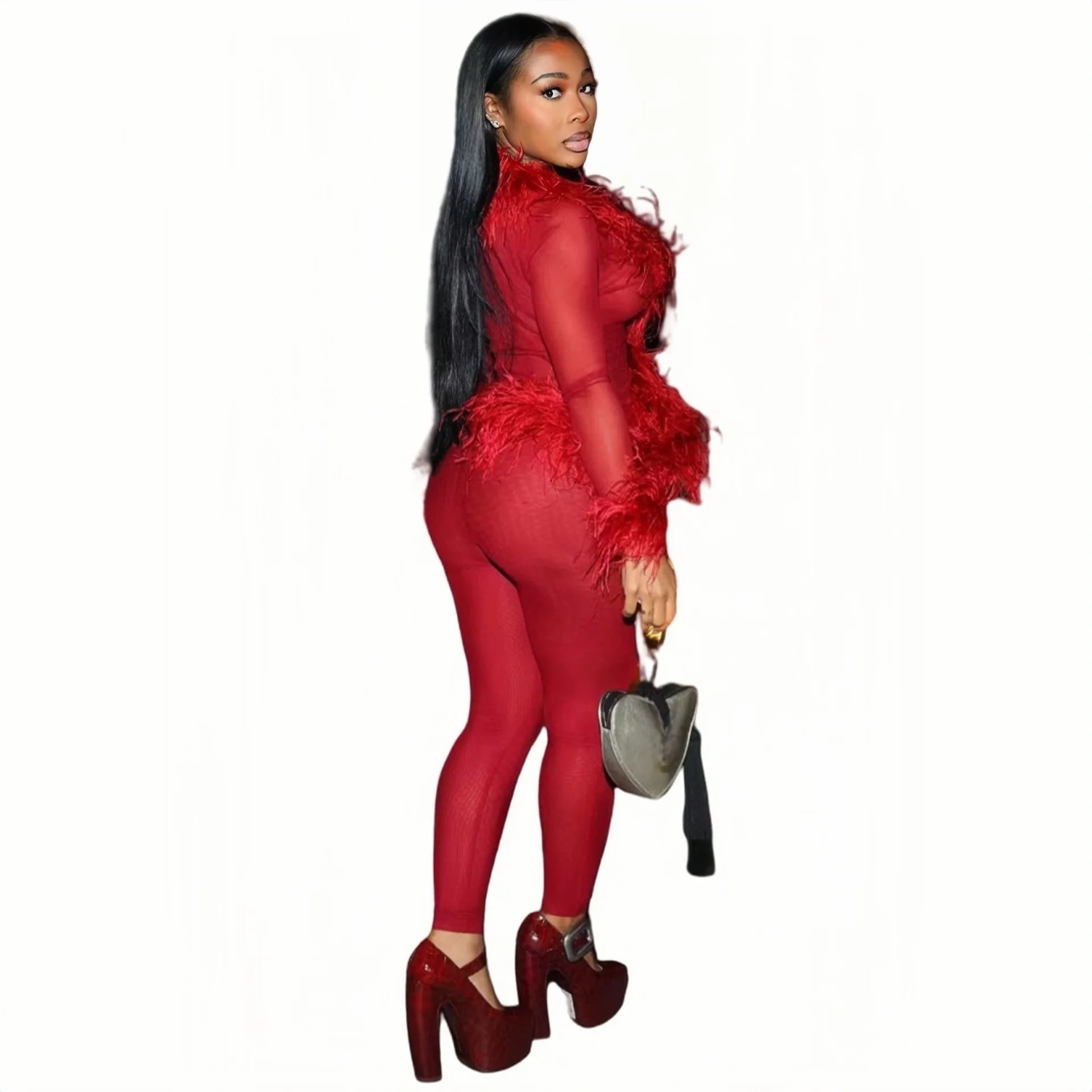 CN8833 European American New Women's Fashion Sexy Bow Collar Half Transparent Mesh Set with Long Sleeves Feather Tassel Knee