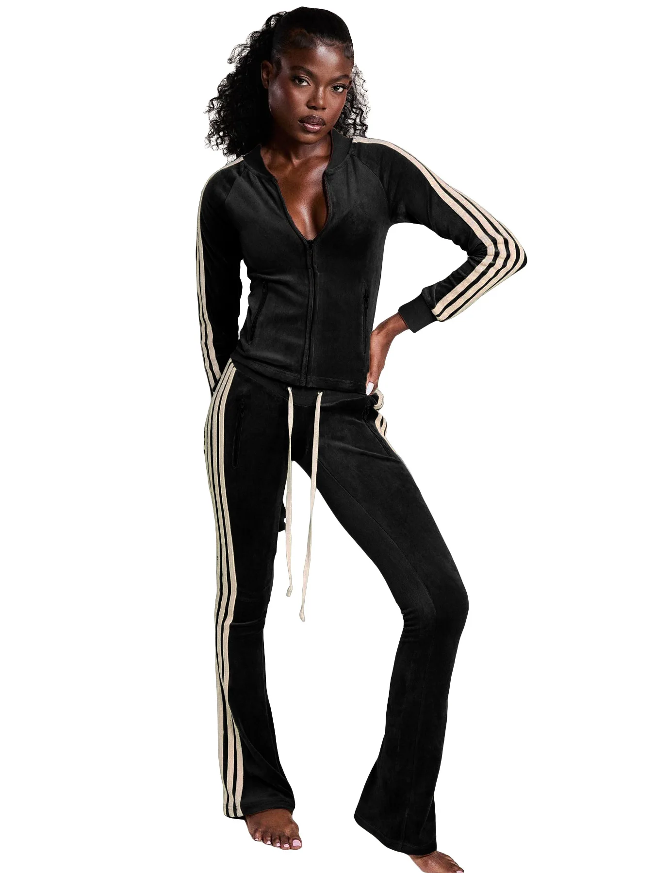 CN25067 European American Casual Women's Bow Loose Fit De Rong Zipper Drawstring Side Stripe Flared Knee Long Pants Two-Piece