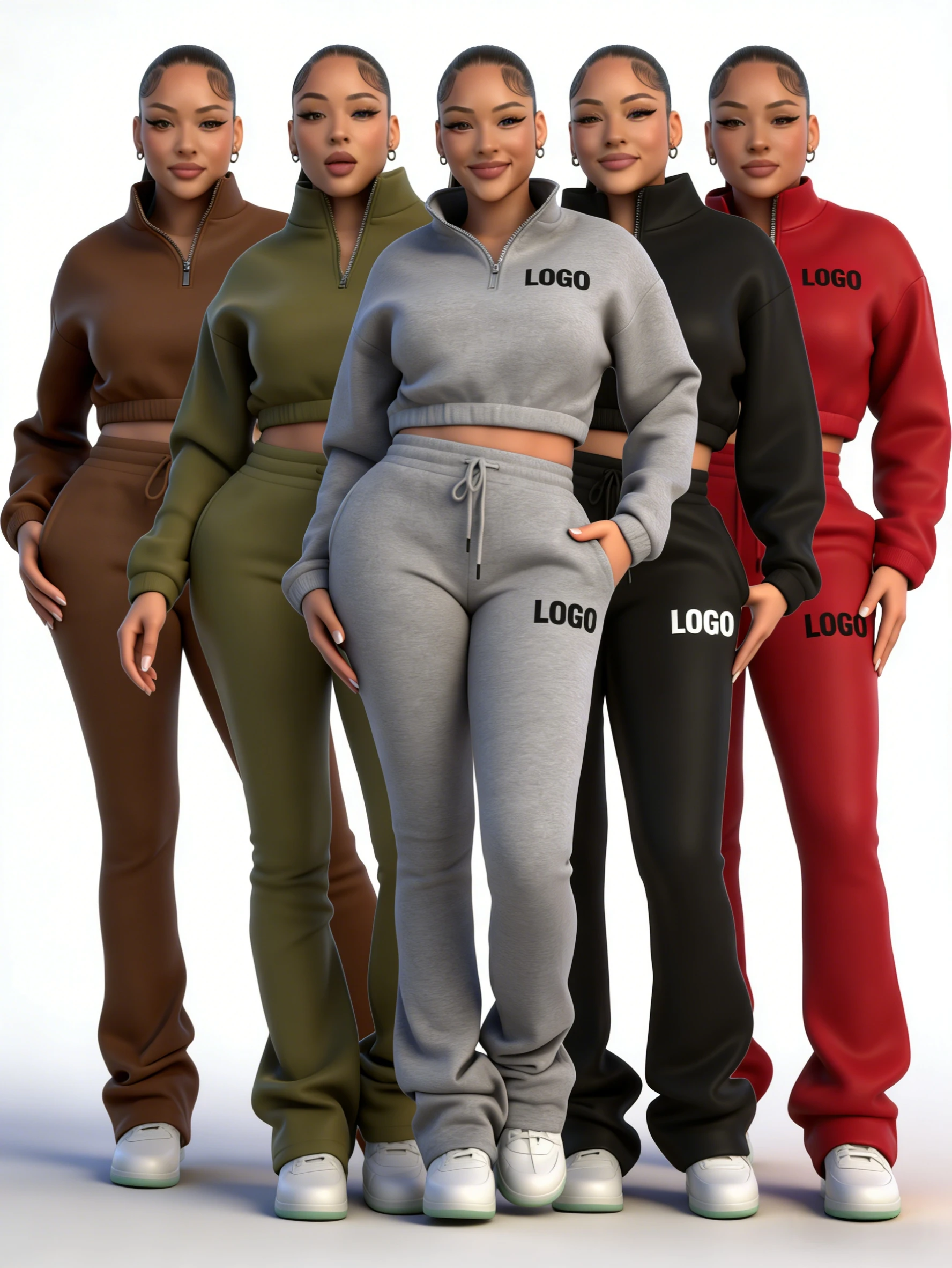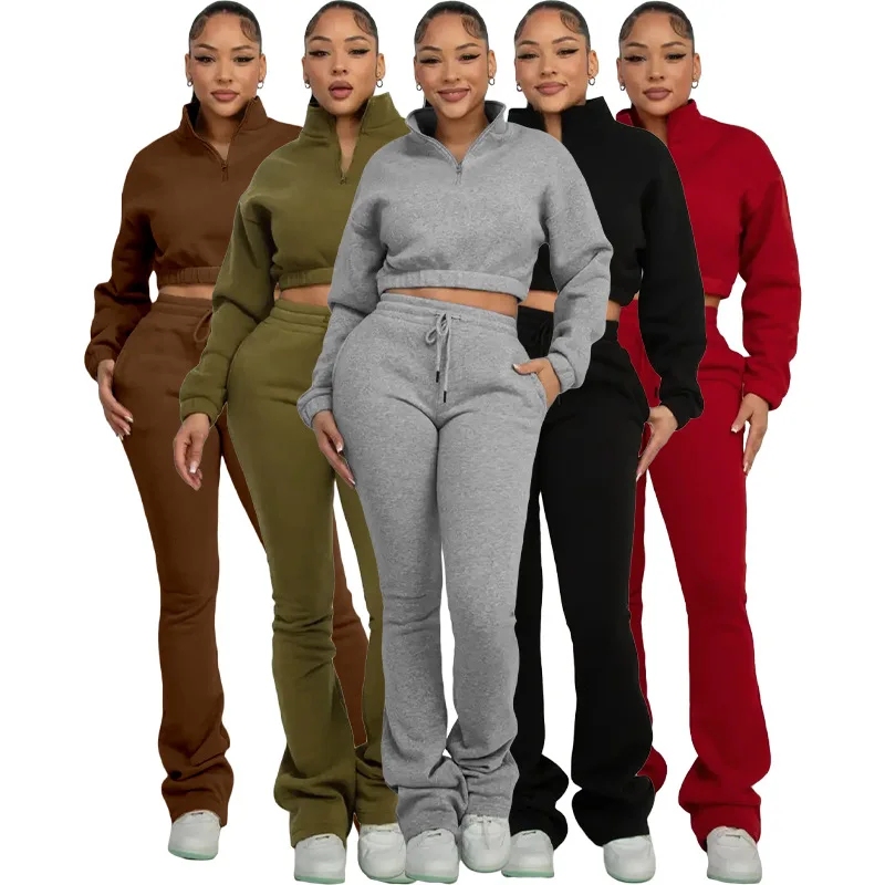 CN25069 European American Fashion Women's Loose Fit Bow Half-Zip Cropped Fleece Sweatshirt Flared Pants Casual Two-Piece Set
