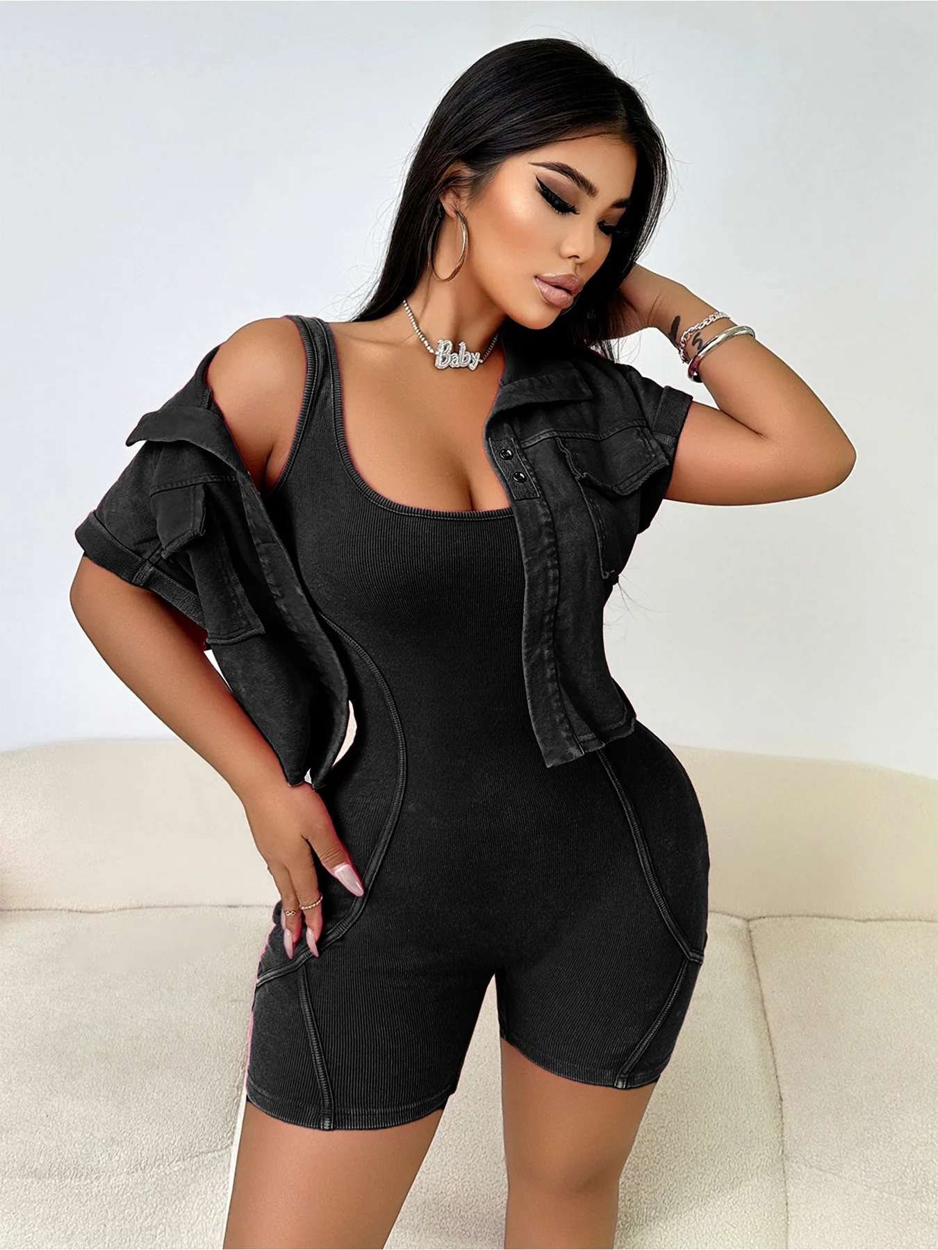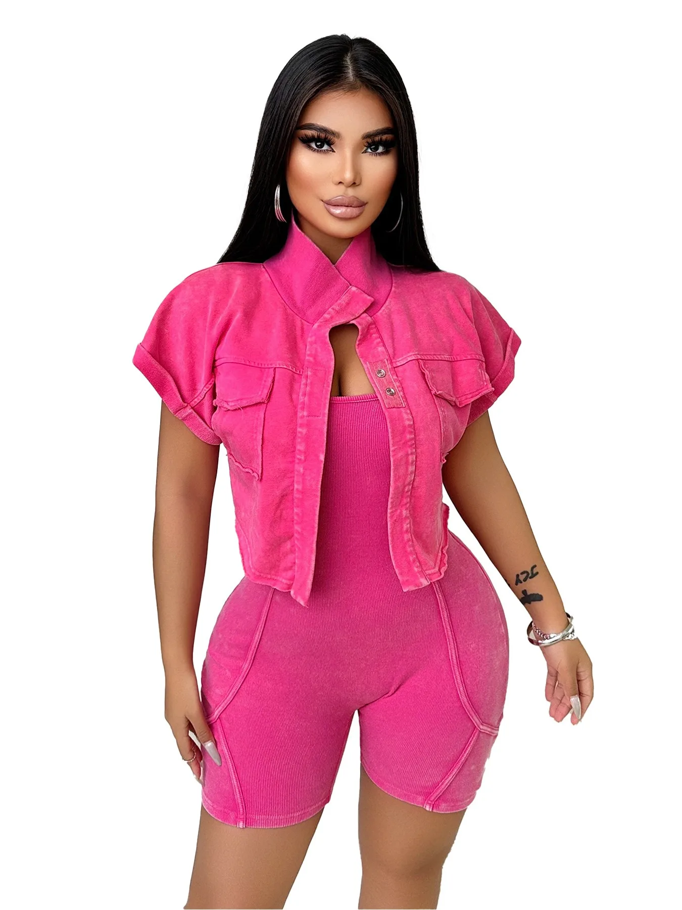Truen New Summer Women's Casual Club Jumpsuit Solid 100% Cotton Waterproof Midi-length Jacket Short Sleeves Worn-Washed Knitting