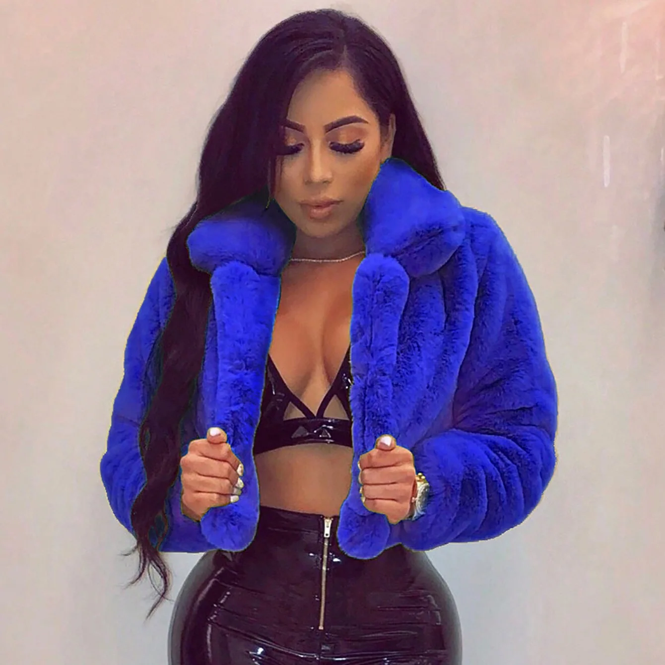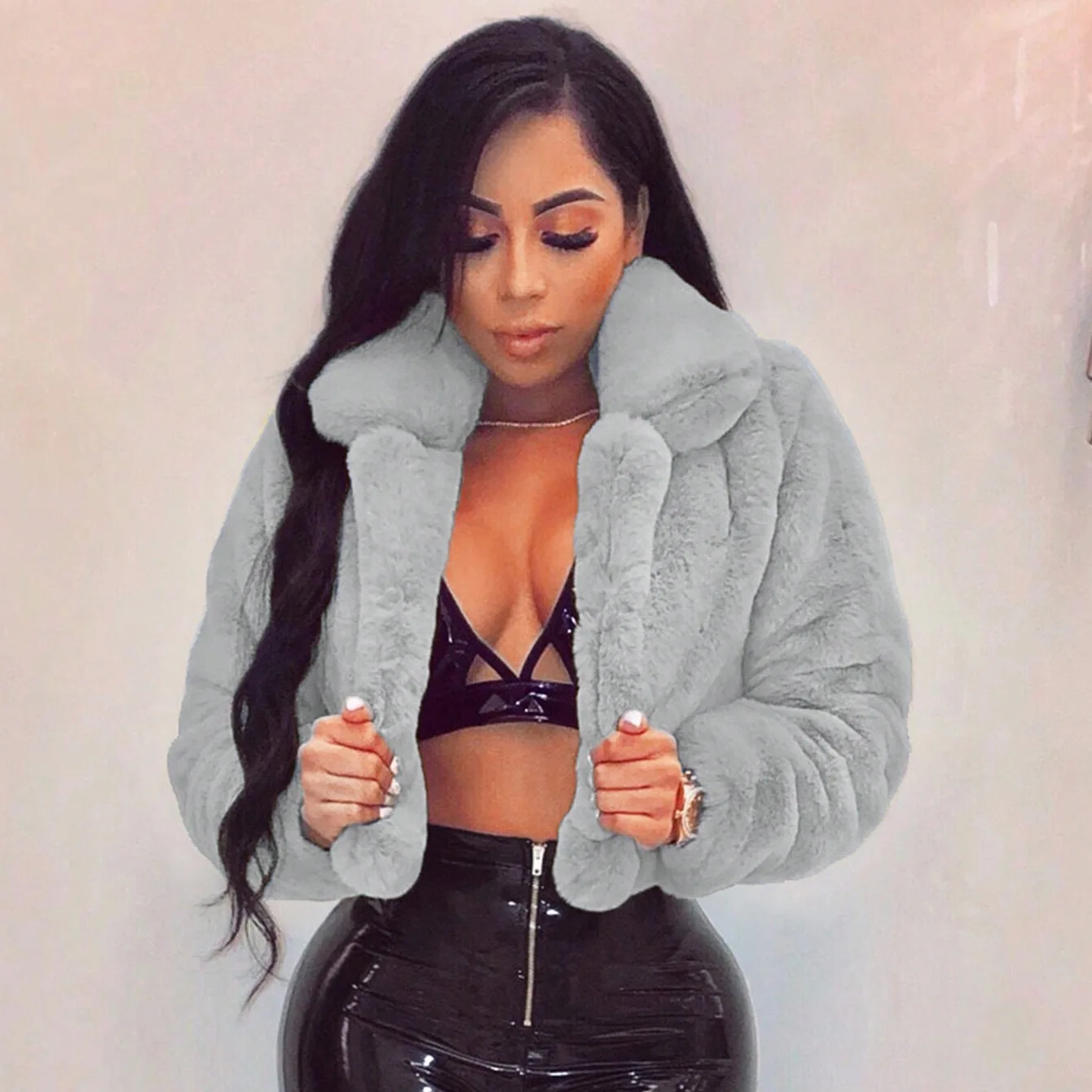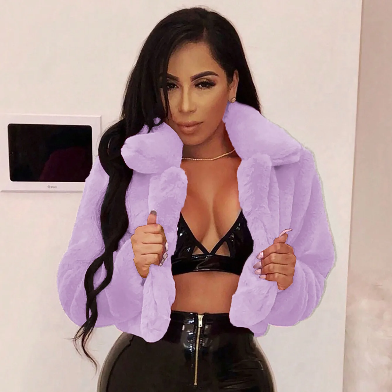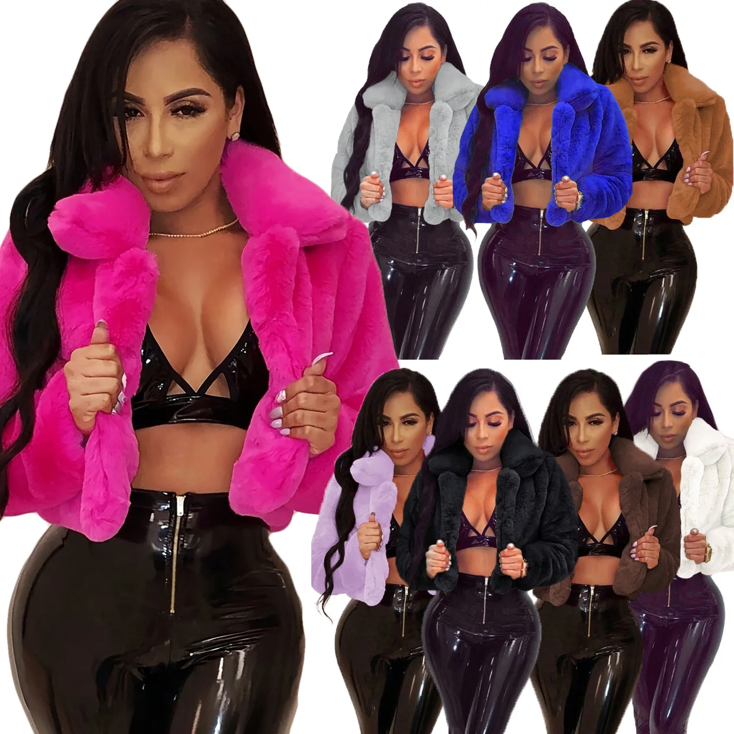 CN391021 European American Autumn Winter Loose Faux Fur Cardigan Short Jacket Fleece Coat 3D Pattern Button-Up Collar Polyester