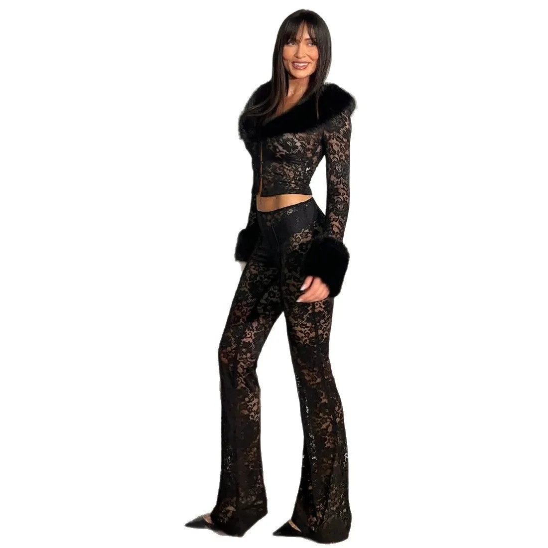 European American Cross-Border Autumn Winter Women's Fashion Two-Piece Set Sexy See-Through Long Pants Fur Collar Lace Splicing