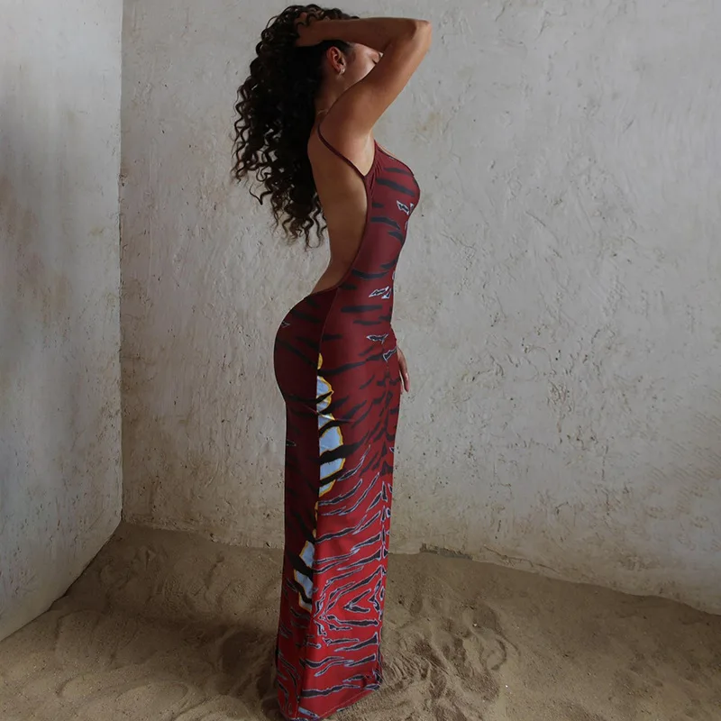 Truen Women's European American Autumn New Fashion Solid Pattern Floor-Length Dress Sexy Bareback Strap Bag Hip Split Woven