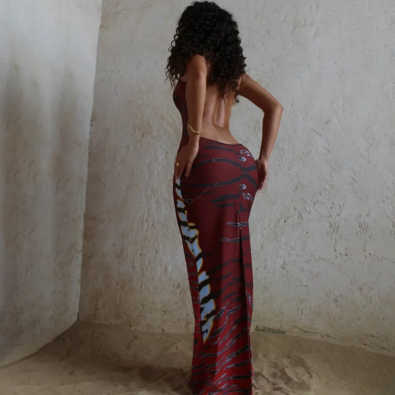 ZYHT 73957 Hot Selling Women Lady Printed Satin Beige Mermaid Fish Tail Floor Length Party Cocktail Evening Dress Gown