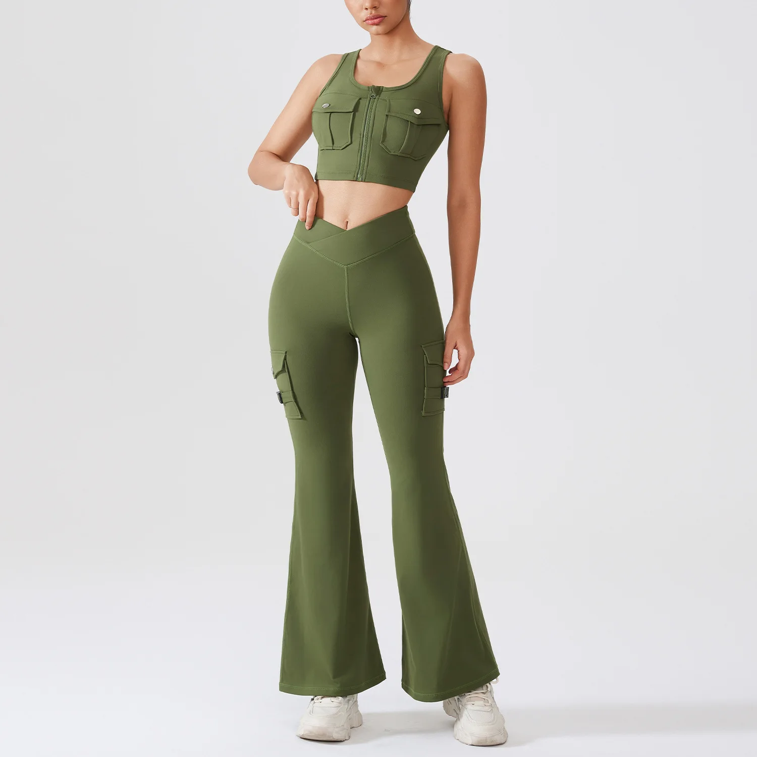 Women's Cargo Pocket Yoga Set 2025 High Waist Flared Leggings Crop Top 4-Way Stretch Quick Dry Workout Outfit for Gym Fitness