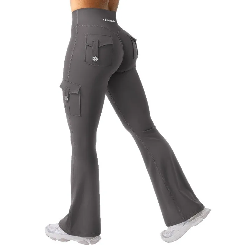 High Waist Flared Cargo Leggings - Multi-Pocket Button Detail 4-Way Stretch Women Fitness Pants