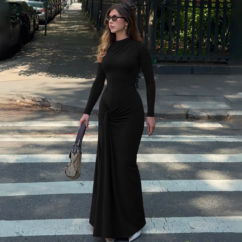 ZYHT 73849 European Wholesale Fashion Casual One Shoulder Ruched Maxi Dress Side Slit Pleated Long Sleeve Dresses for Women