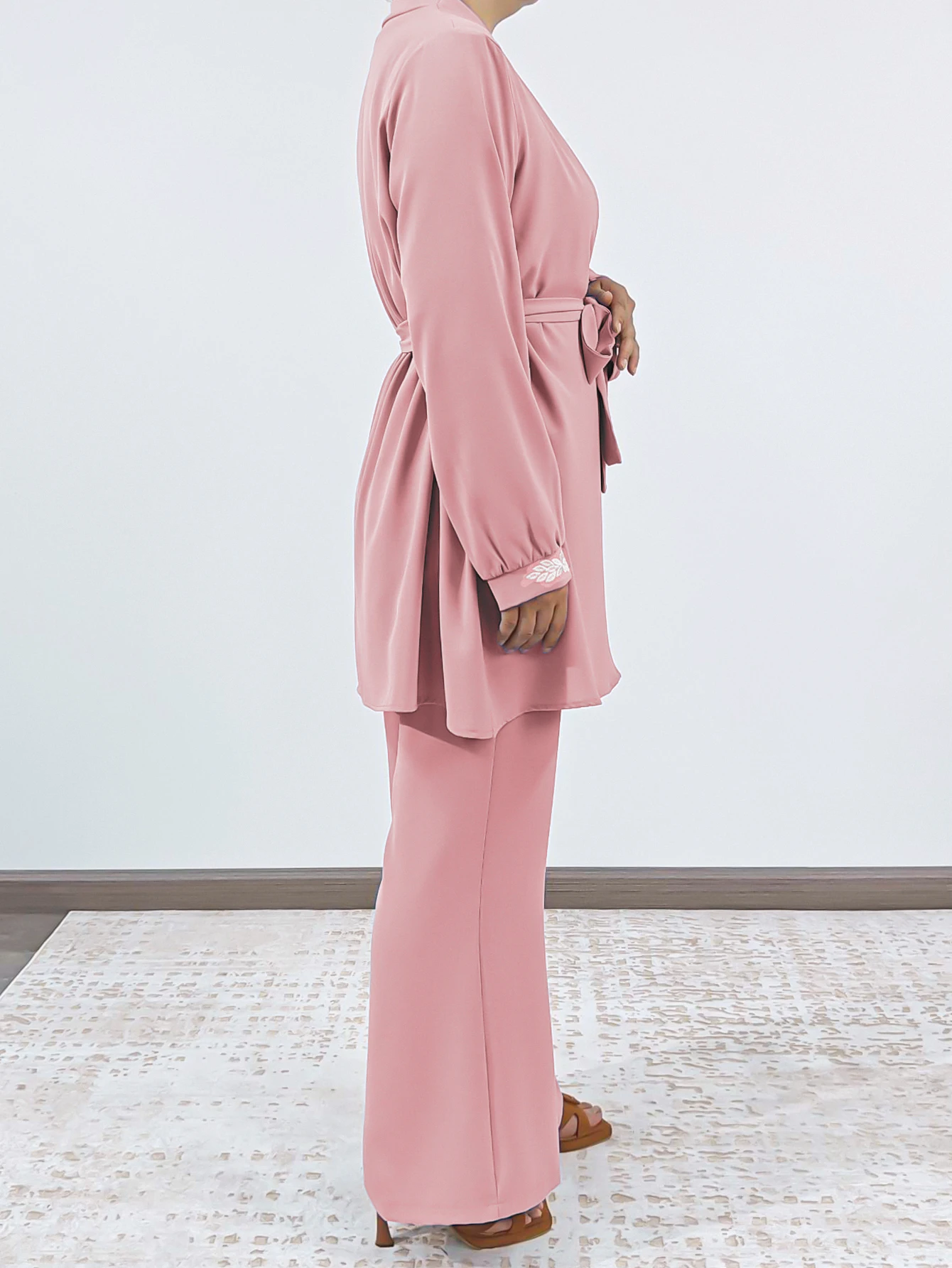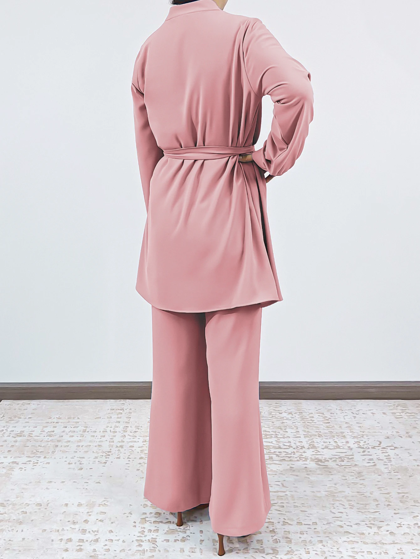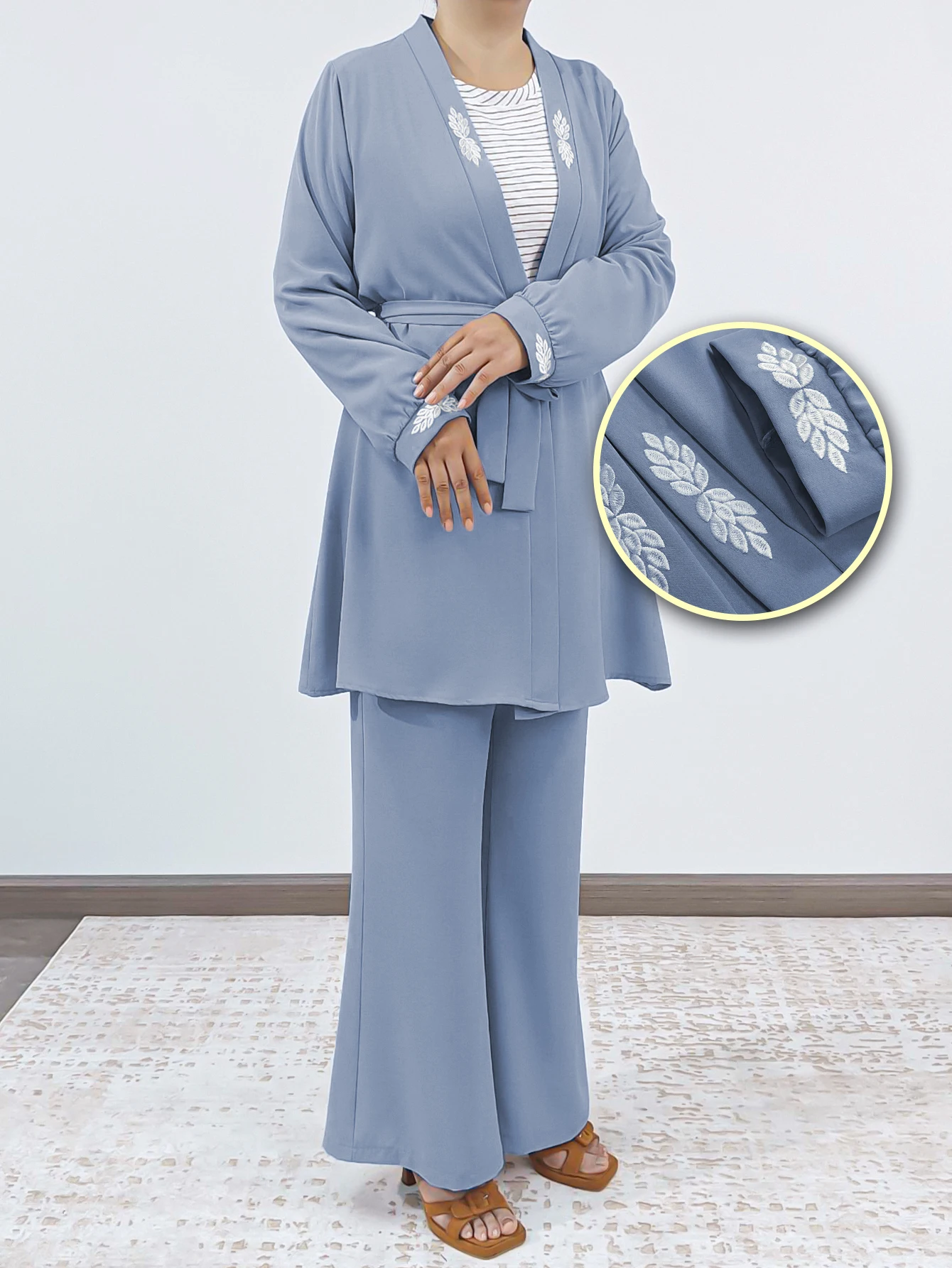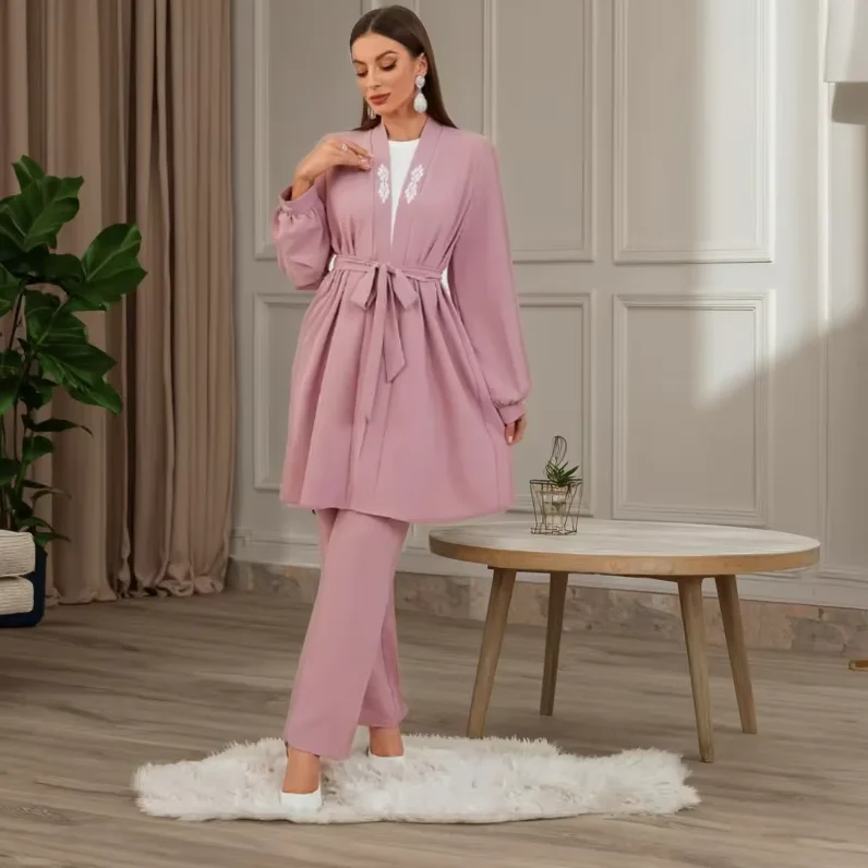 Daily Elegant Simple Islamic Wear Solid Crepe Tops Pants Set Front Open Bowknot Drawstring Blouse Trousers Suit Muslim Abaya