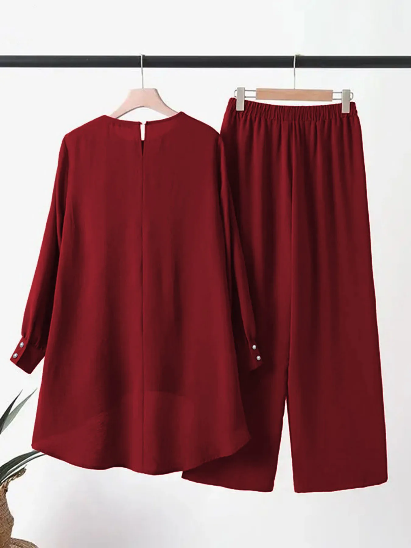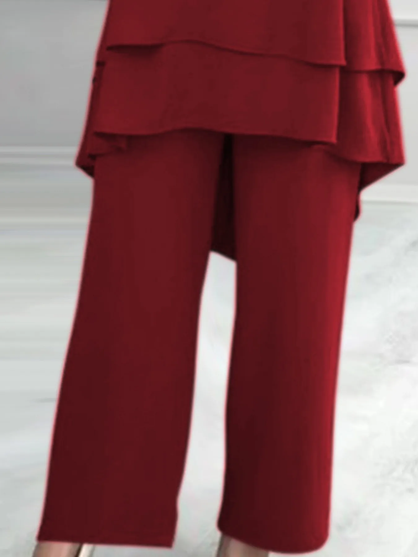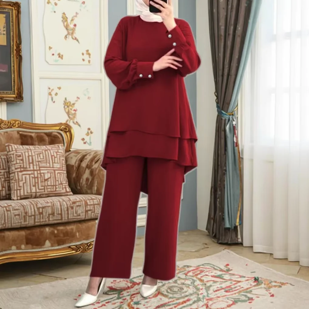 Casual Middle Eastern Ladies Abaya Suit Wholesale Layered Top + Wide-Leg Pants Two-Piece Solid Color Ruffled Women Muslim Suit