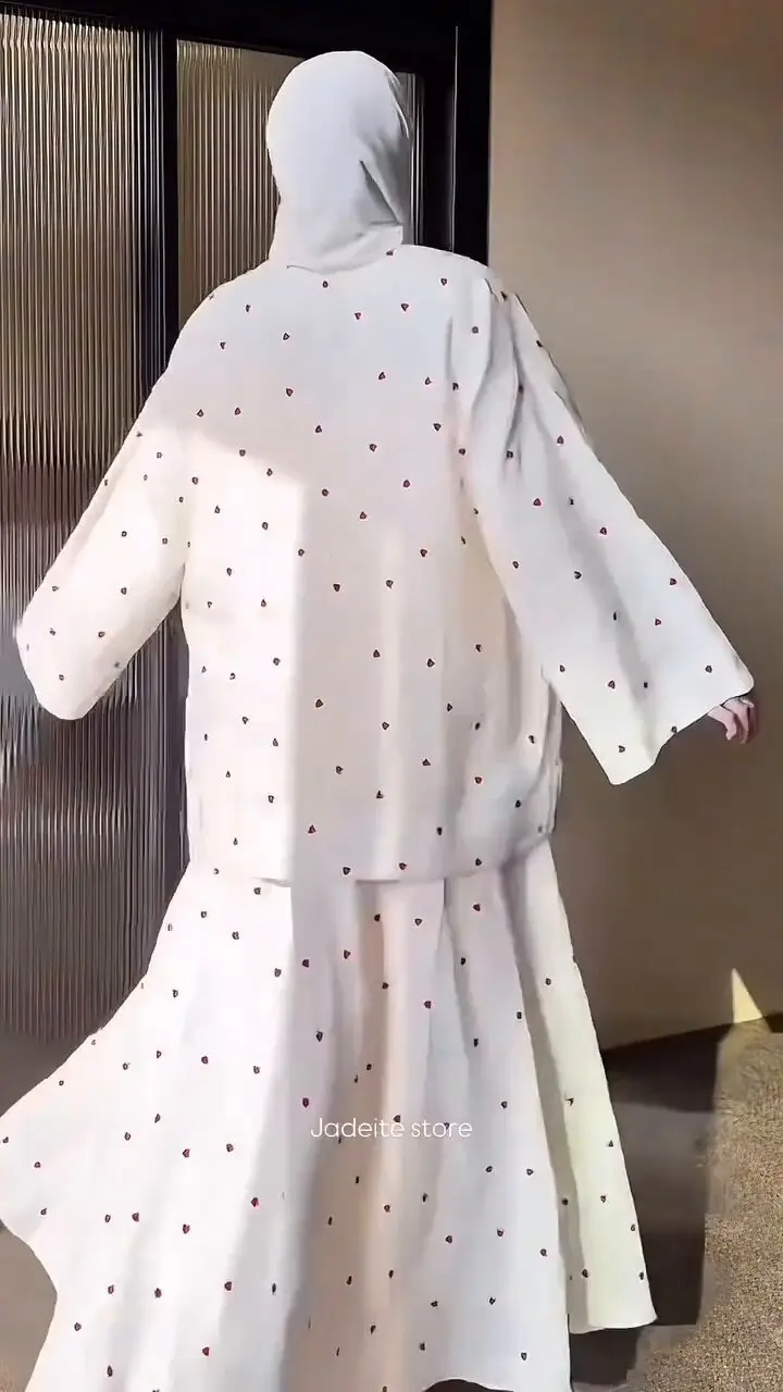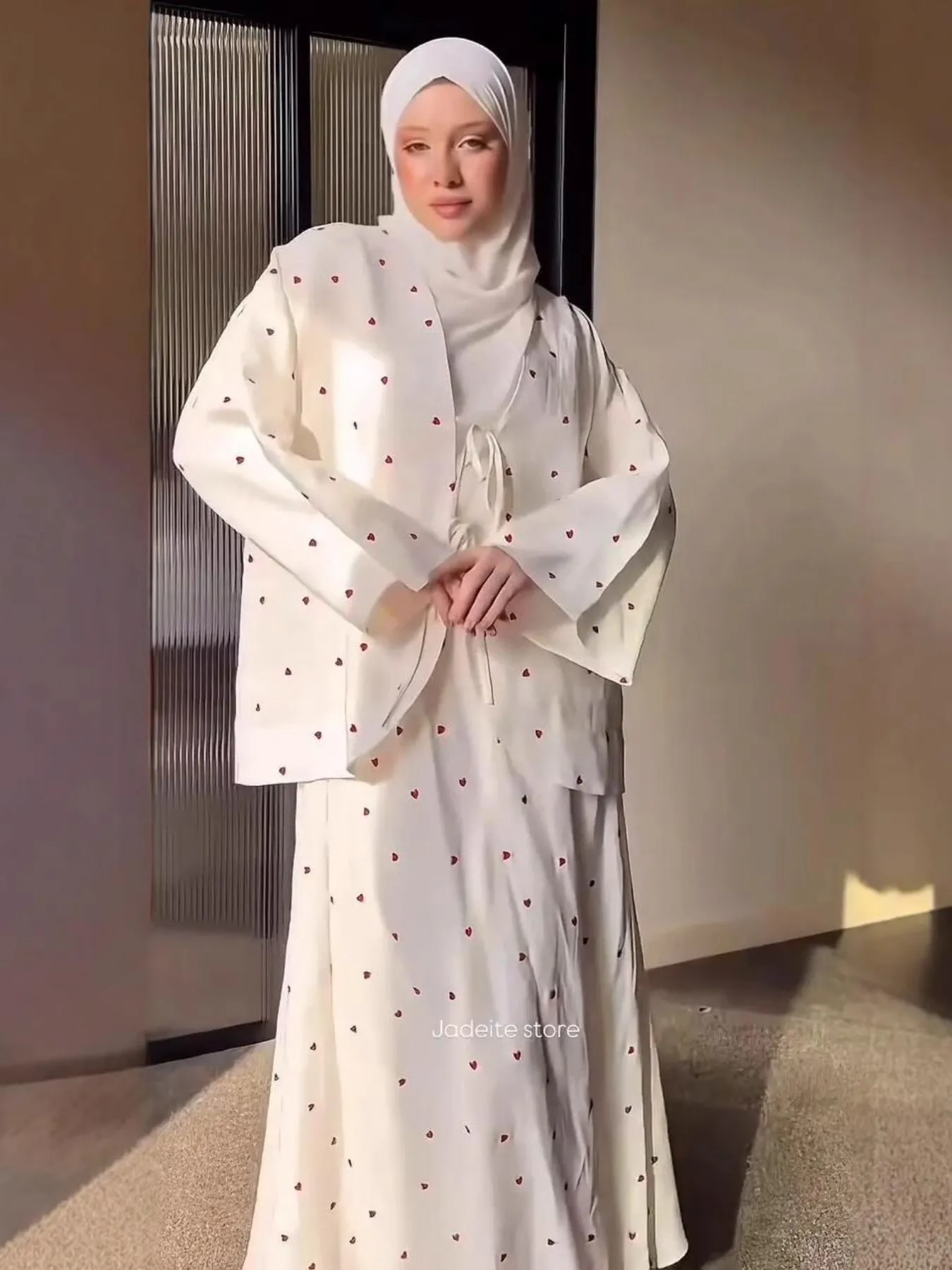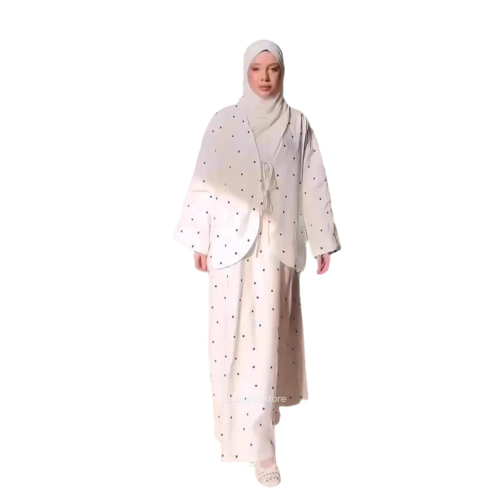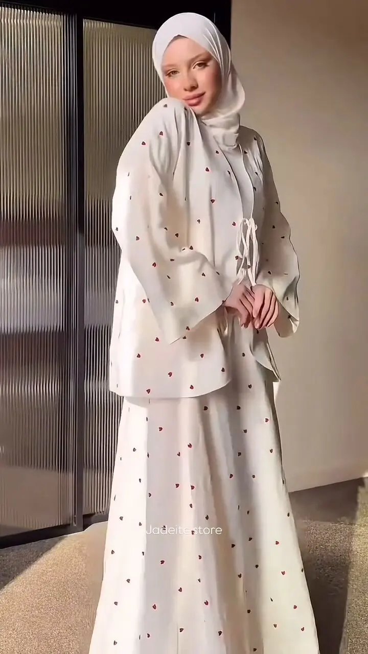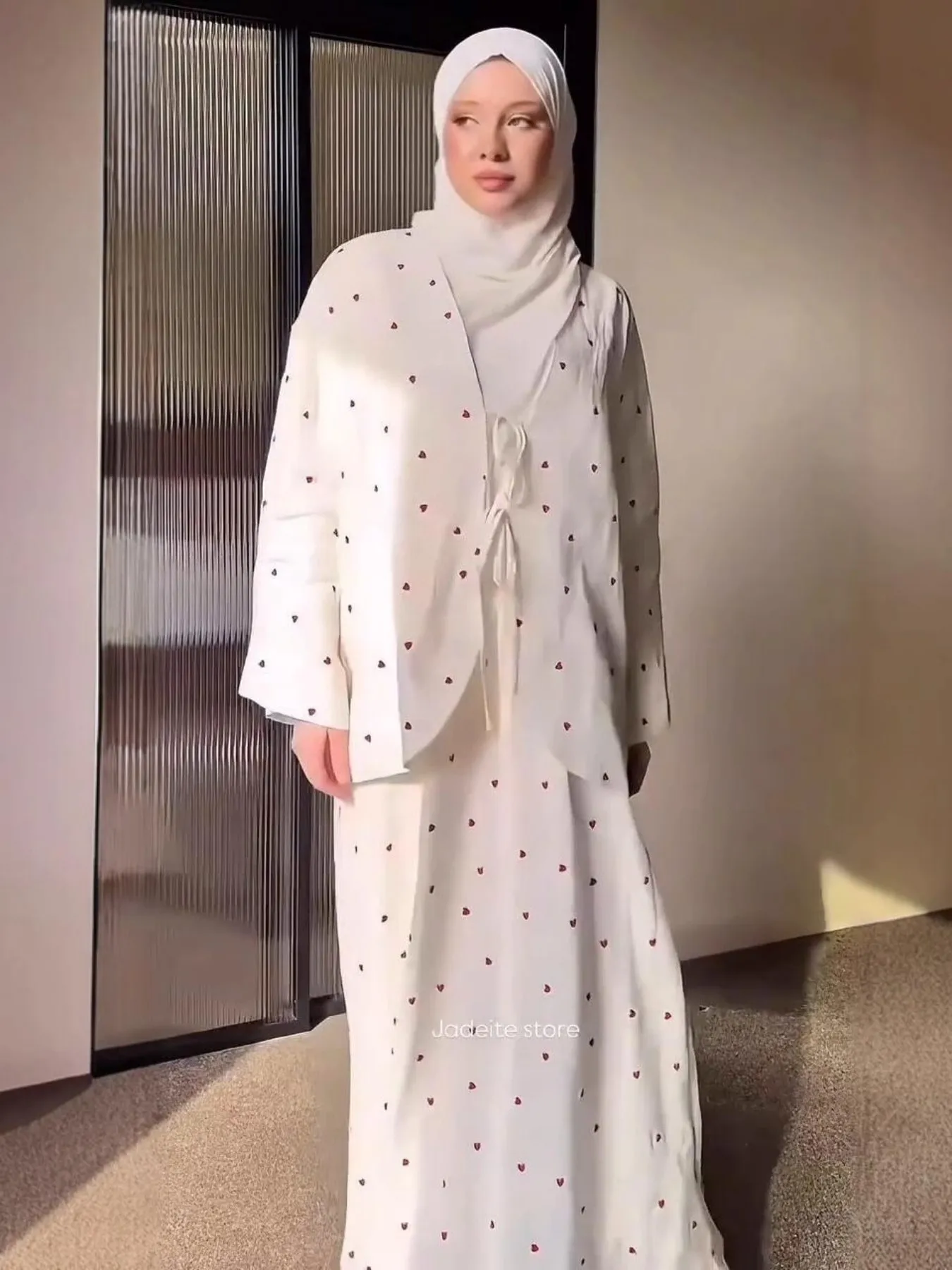 Lightweight White Heart Printed Loose Trumpet Sleeve Top Wide-Leg Pants 2 Piece Set Elegant Comfortable Daily Muslim Clothing