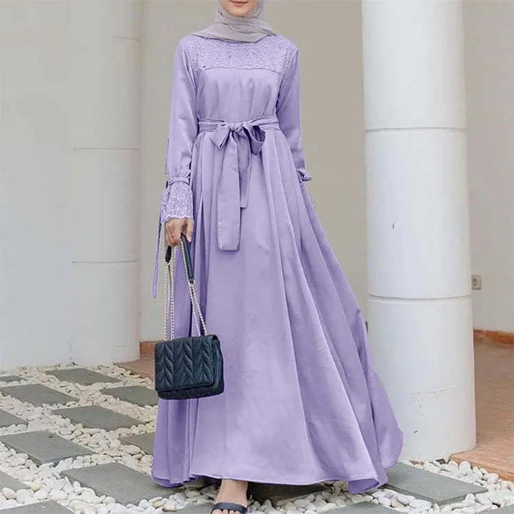 Fashion O-neck Stitching Mesh Yarn Elegant Solid Color Adjustable Belt Dress Plus-size Commuter Muslim Dress