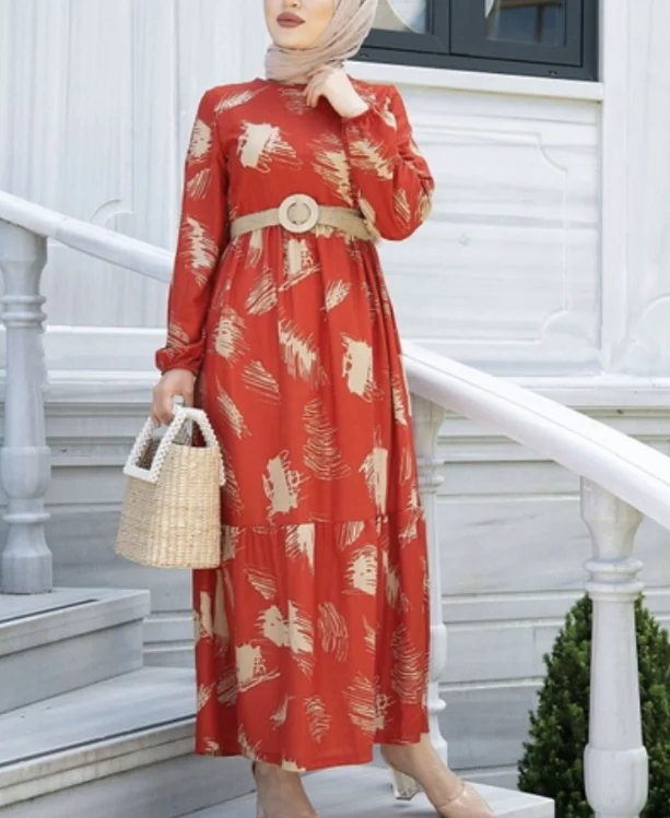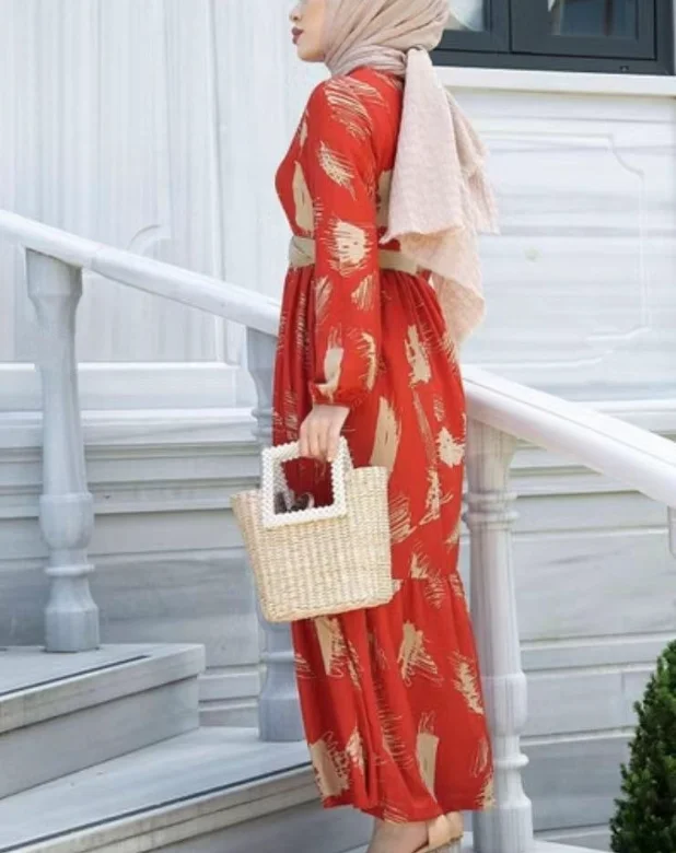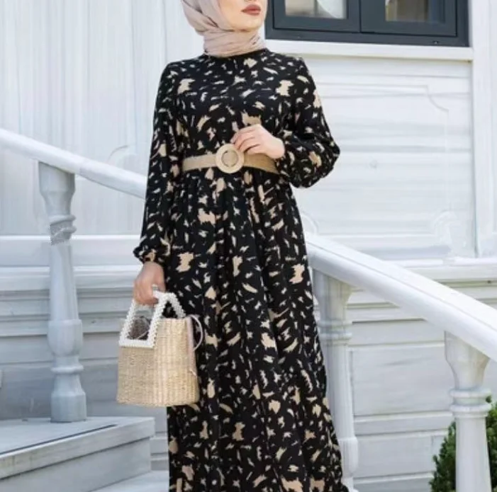 Middle Eastern Muslim Printed Round Neck Long Sleeve Printed Lace-up Dress Vintage Plus Size Women's Clothing