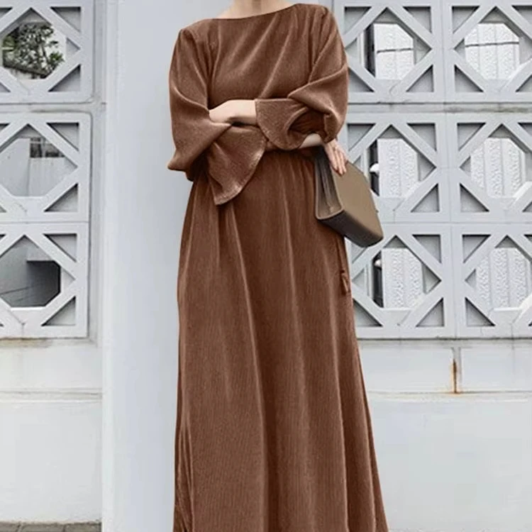 Fashion Solid Color Pit Length Dress Long Striped Skirt with Adjustable Belt Plus-size Round Neck Muslim Women's Dress
