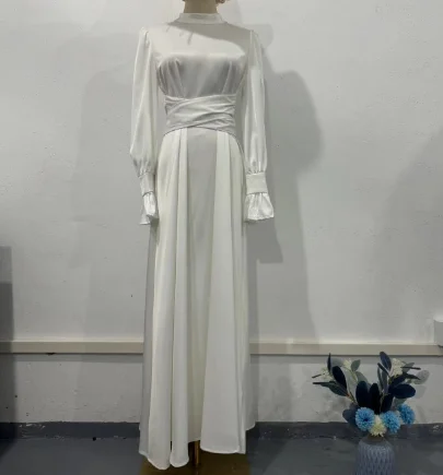 Elegant Solid Color Sweet Dress Skirt with Puffed Sleeves and Lace-up Waist Plus-size Party Muslim Dress