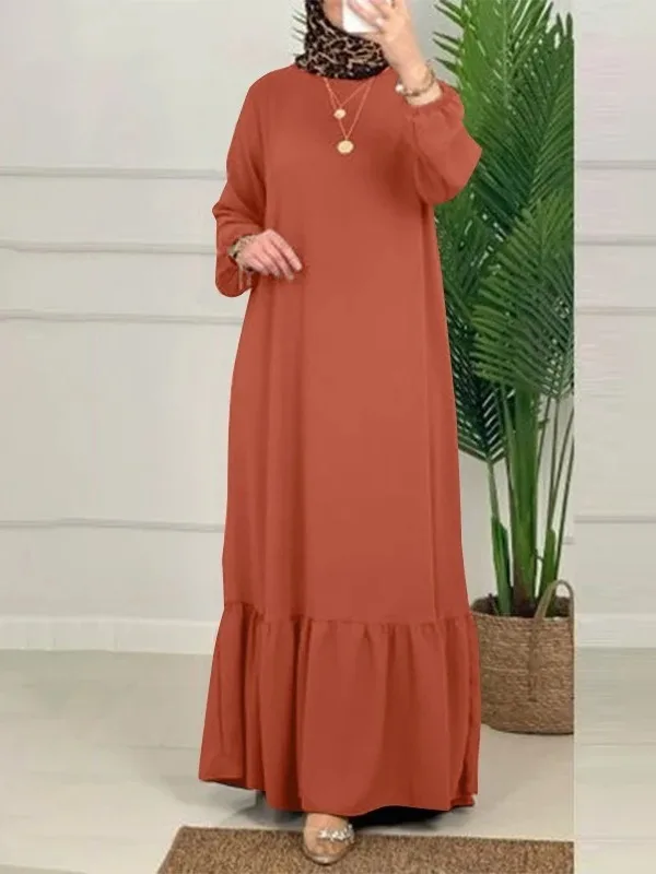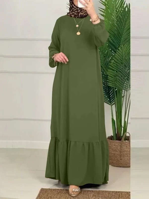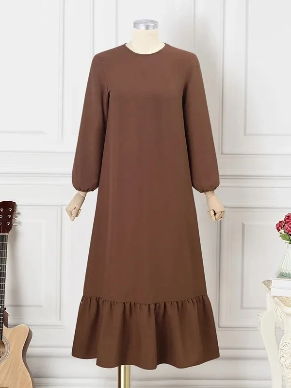 Vintage Solid Color National Costume Robe with Bubble Sleeve Ruffles Modest Long Dress for Eid Stock Arabic ABaya Dress