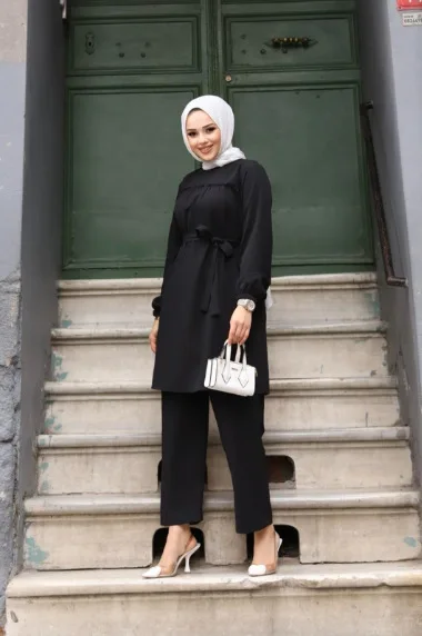 Women's Summer Traditional Muslim Clothing Accessories Casual Arabic Abaya Pants Suit Polyester Material Straight Leg Neck Belt