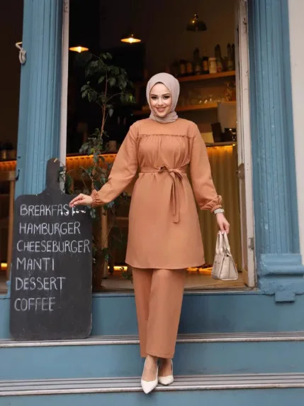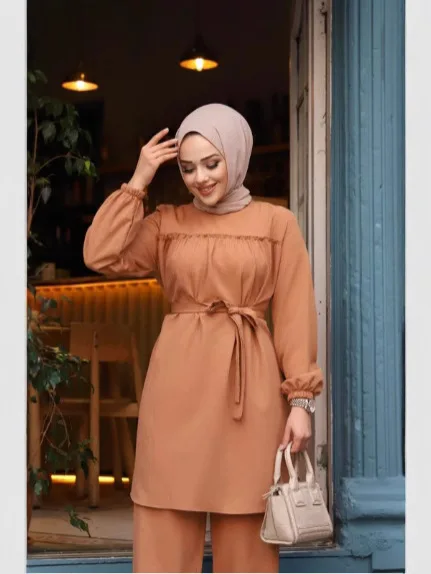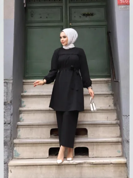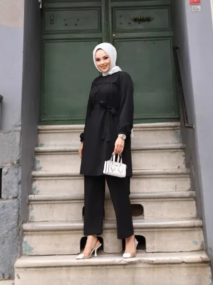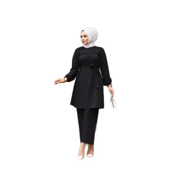 Women's Summer Casual Arabic Abaya Polyester Straight Leg Pants Suit with Neck Belt Jacket Muslim Evening Dress Fashion