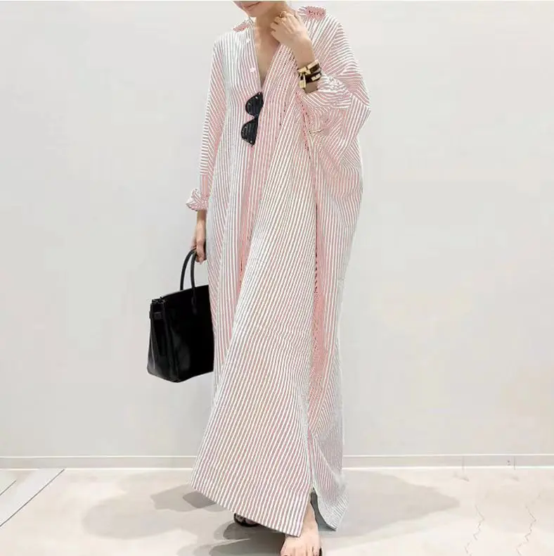 Hot Sale Casual Long Sleeve Cotton Cardigan Plus-size Striped Floor-length Dress Multi-colored POLO Collar Irregular Dress