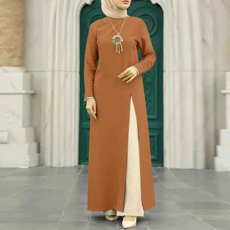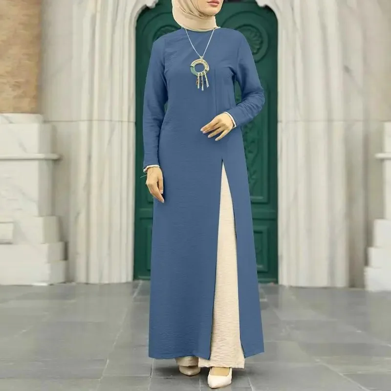Elegant Pure Color Intellectual Dress Ice Silk Ruffled Long Sleeve High Slit Hem Robe Plus-size Summer Muslim Women's Dress