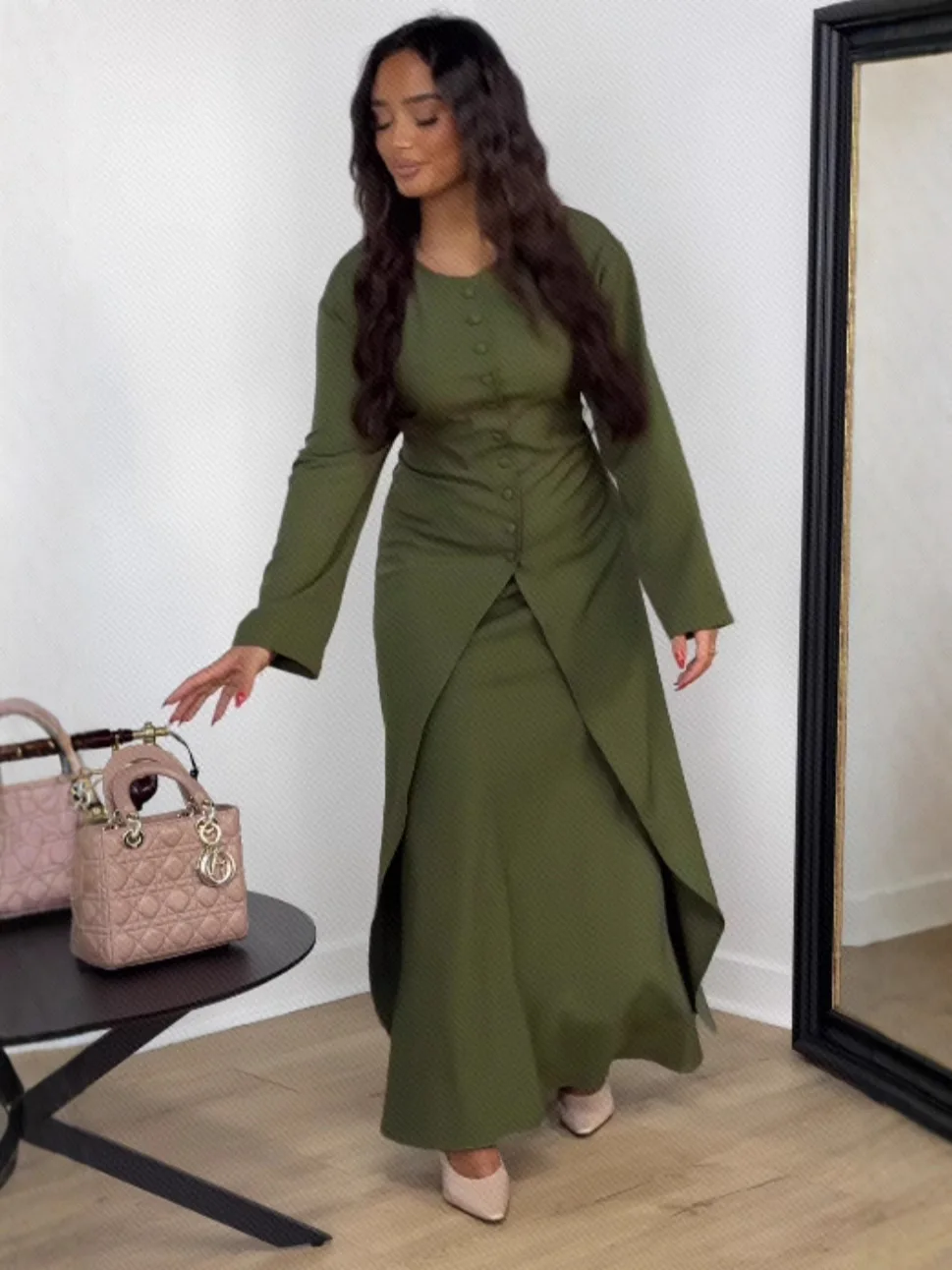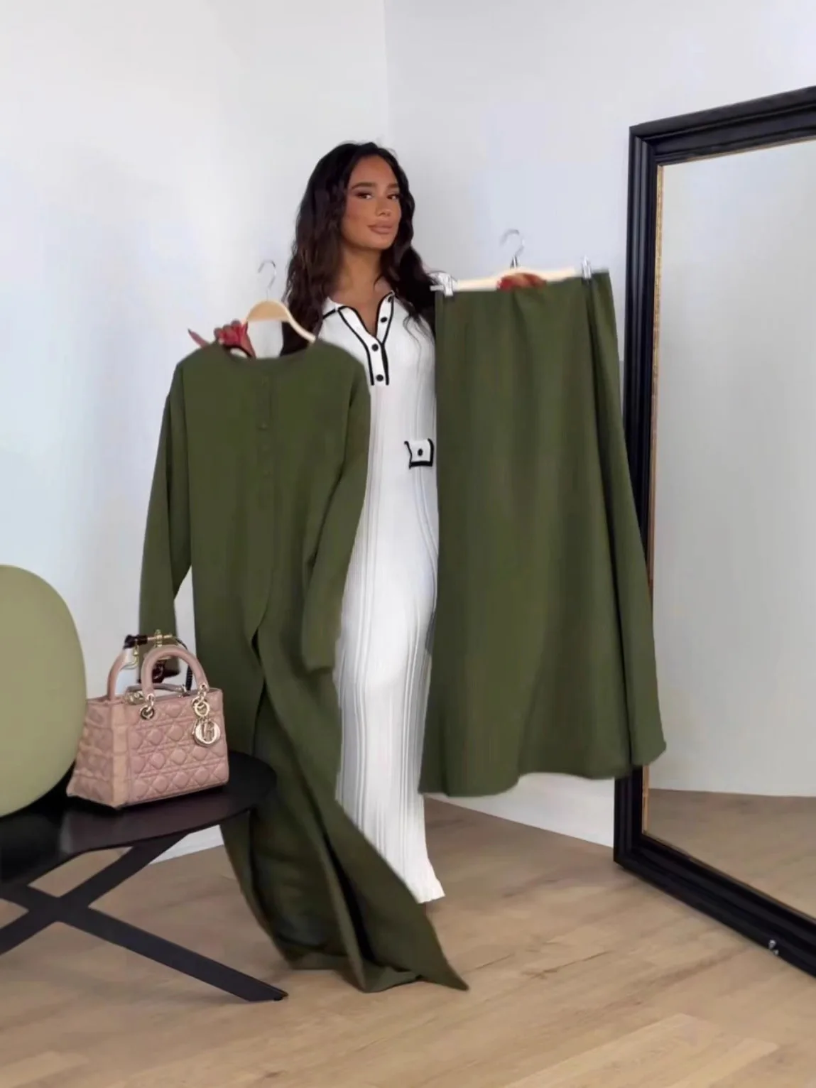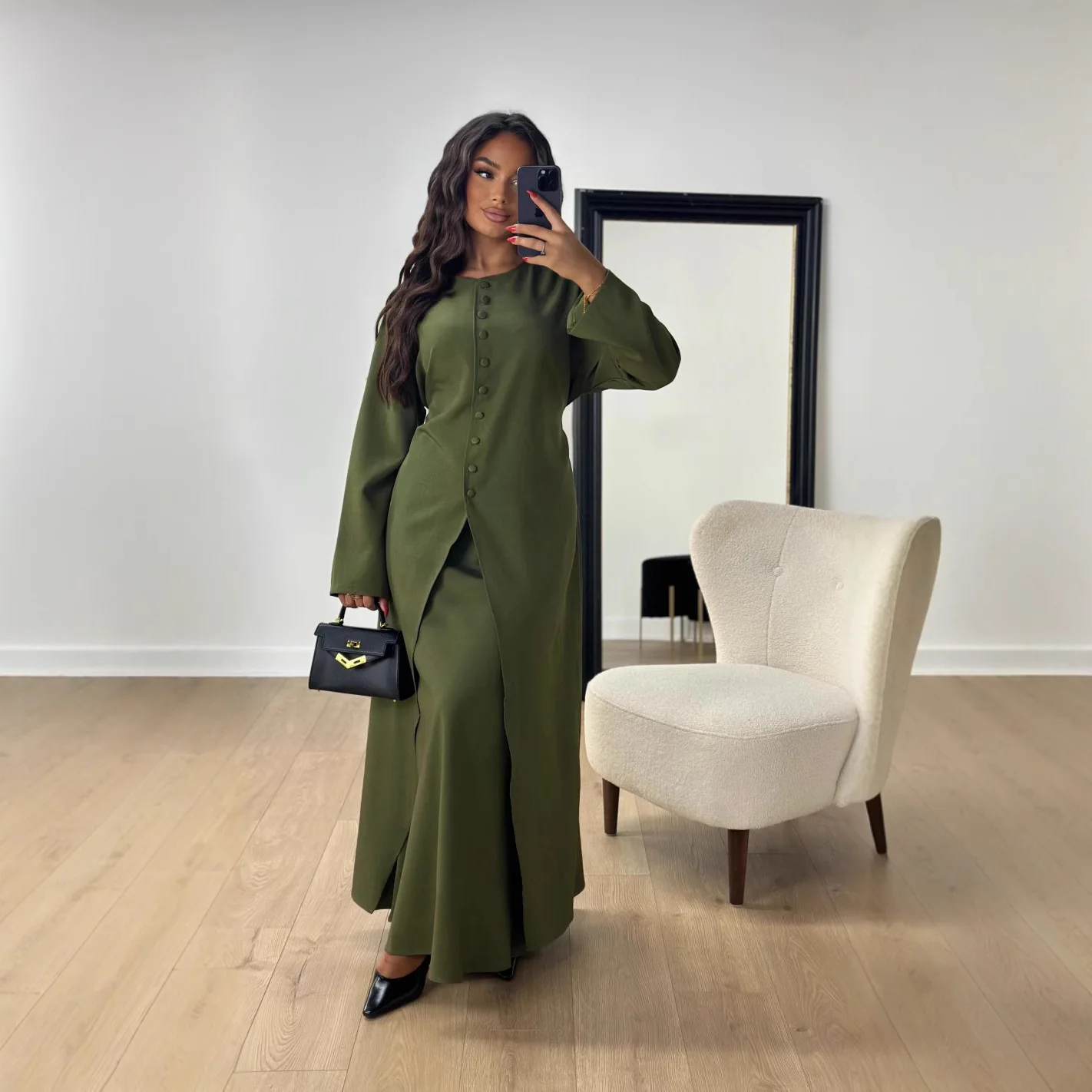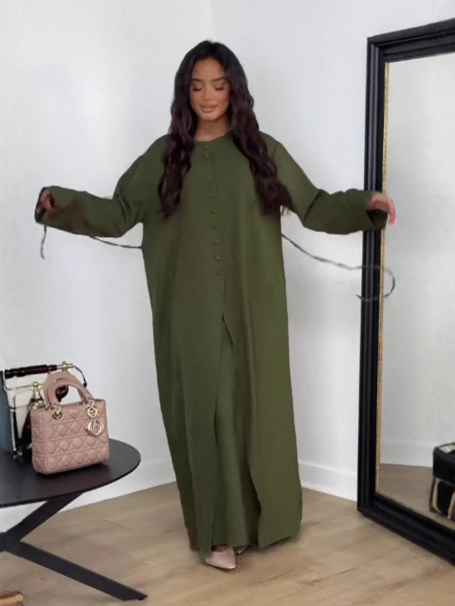 Dubai Turkey Modest Two-Piece Set Solid Color Buttoned Abaya Dress Linen Butterfly Floral Printed Abaya