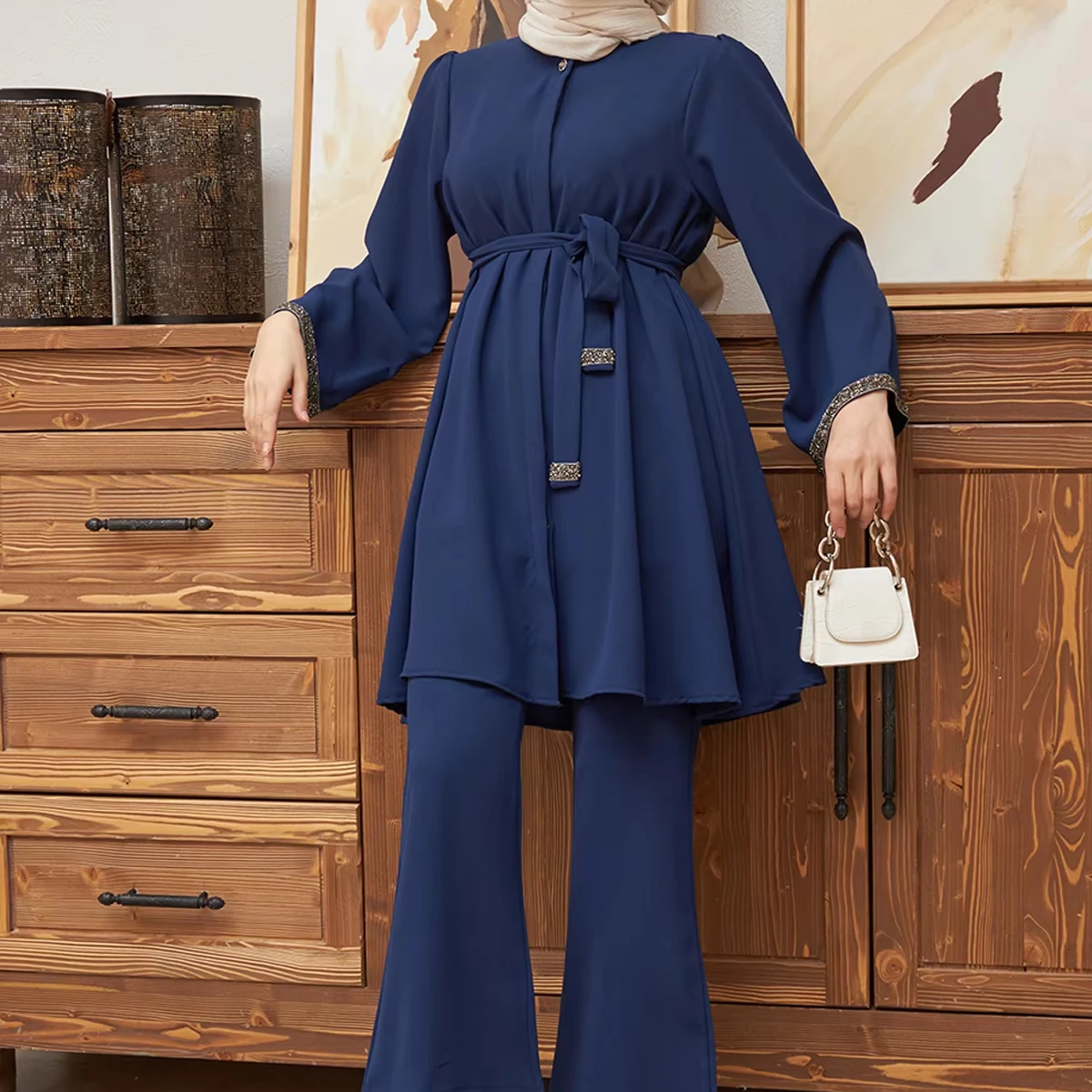 Modest Fashion for Muslim Women Rhinestone Two-Piece Set Pleated Eid Abaya Flared Pants Loose Top Printed Pattern Dress
